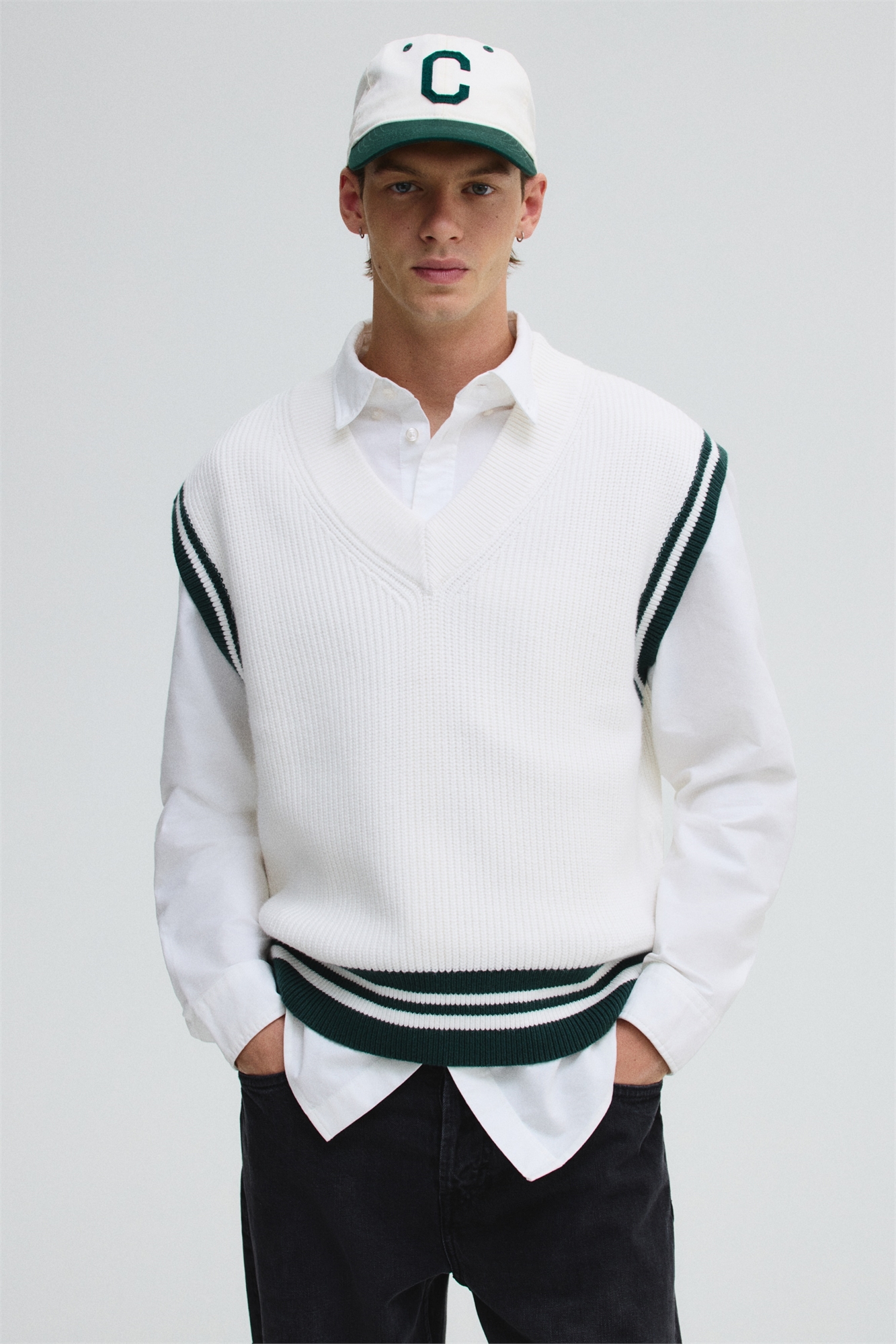 Свитер-жилет из хлопкового микса с ребристой вязкой и контрастными цветными деталями. V-образный вырез и широкая ребристая отделка по вырезу горловины, проймам и подолу. Приталенный крой для пышного, но не чрезмерно большого силуэта.