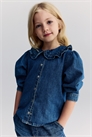 Свободная блузка из мягкого денима с закругленным воротником с оборками, застежками на кнопки спереди и длинными рукавами со сборками на плечах и застежками на манжетах.