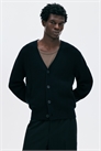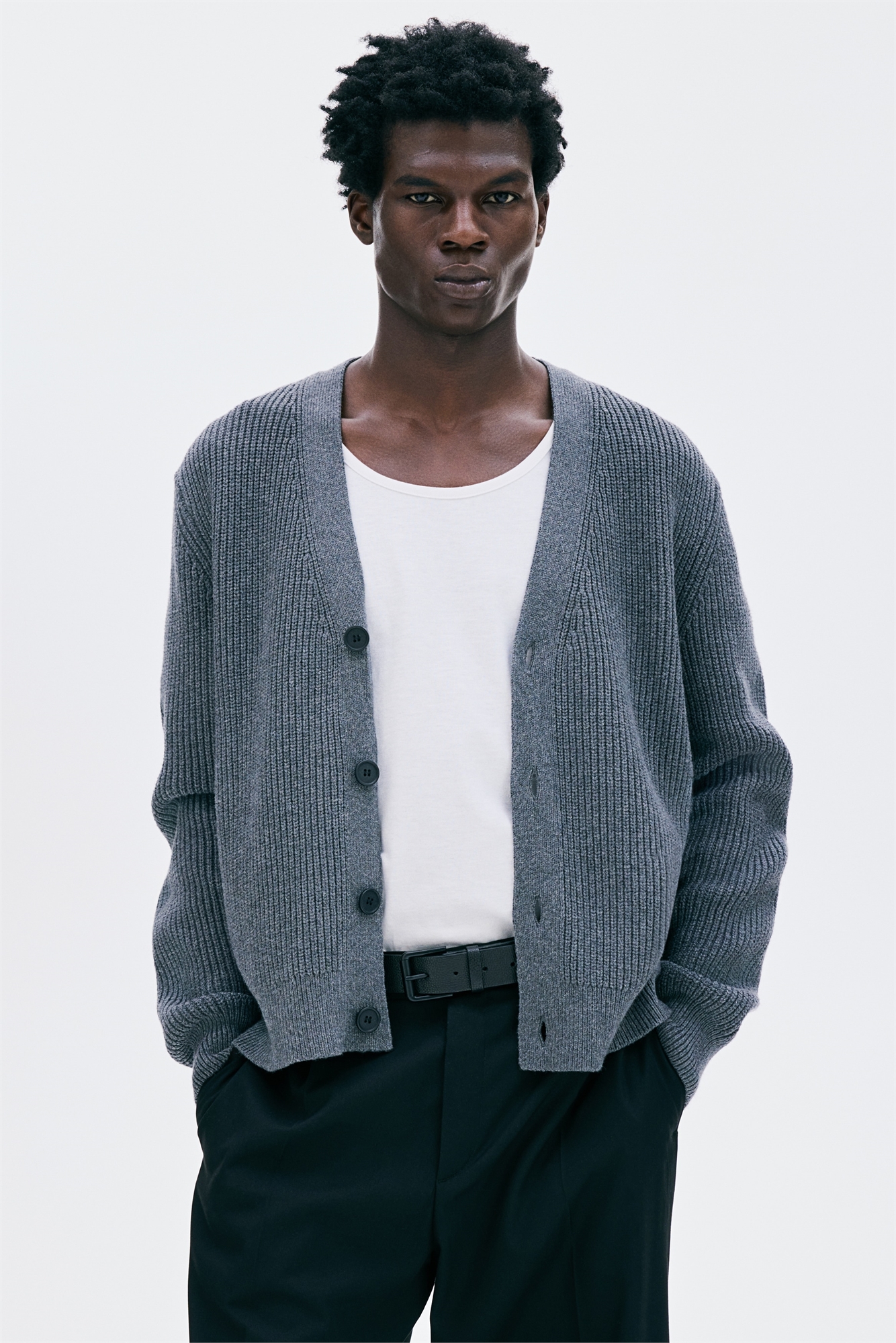 Кардиган из мягкого хлопкового микса с ребристой вязкой, глубоким V-образным вырезом, пуговицами спереди и спущенными плечами. Узкая тесьма вокруг проймы, на манжетах и подоле. Регулярный крой для комфортной носки и классического силуэта.