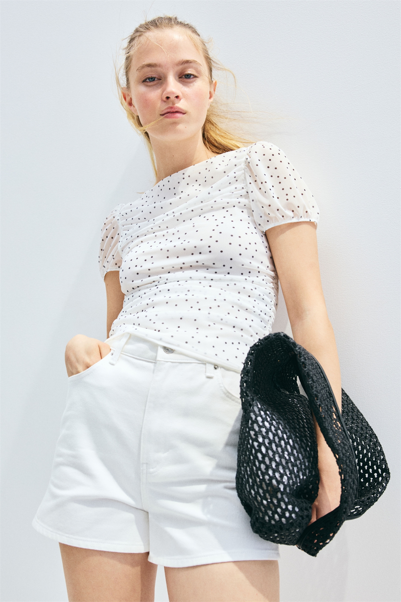 Короткий приталенный топ из узорчатой сетки с рюшами по бокам, создающими эффект драпировки. Вырез-лодочка и короткие пышные рукава с узкими эластичными манжетами. Частично на подкладке.