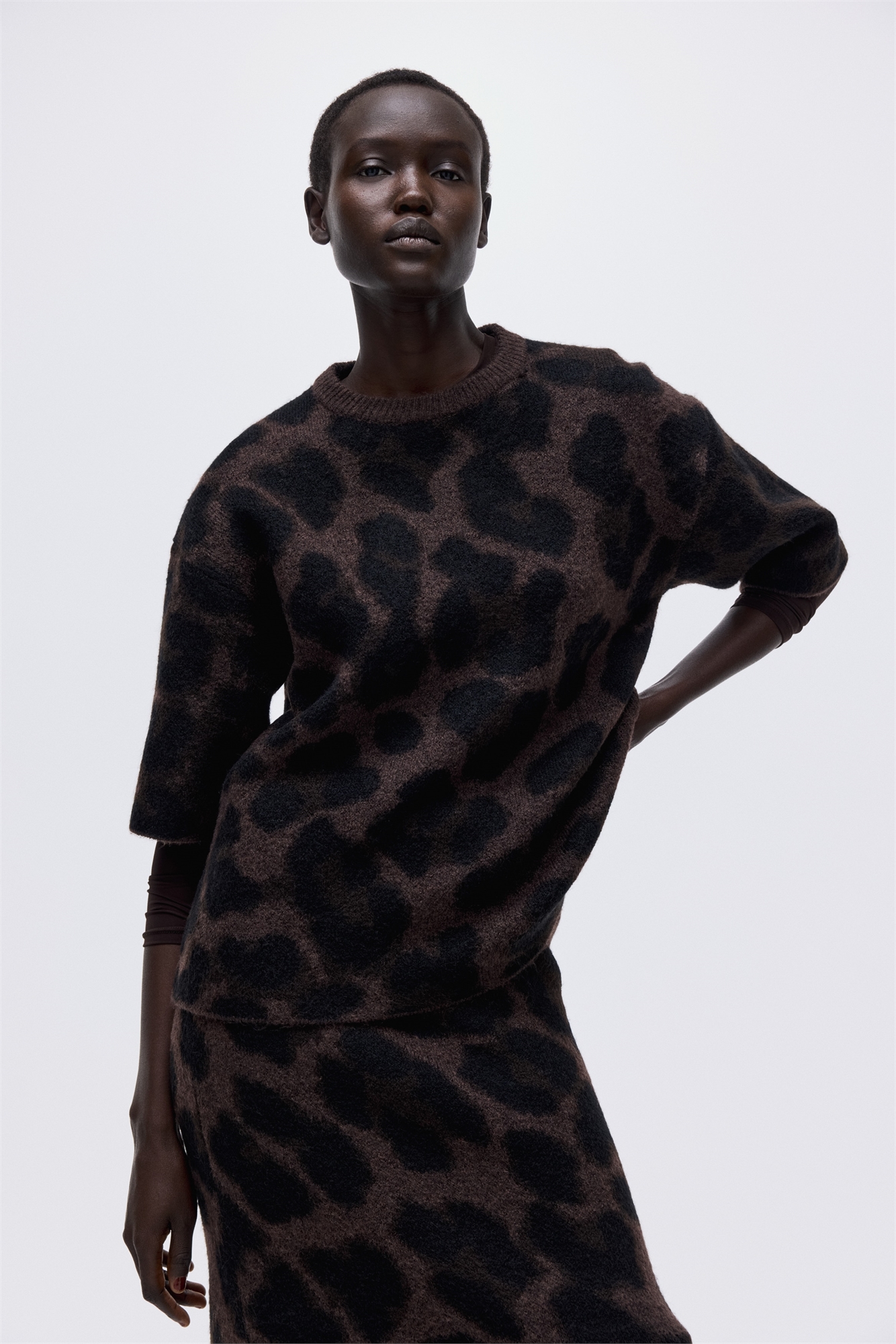 Джемпер свободного покроя из мягкого жаккардового трикотажа с круглым вырезом, отделанным ребрами, спущенными плечами и рукавами длиной до локтя.