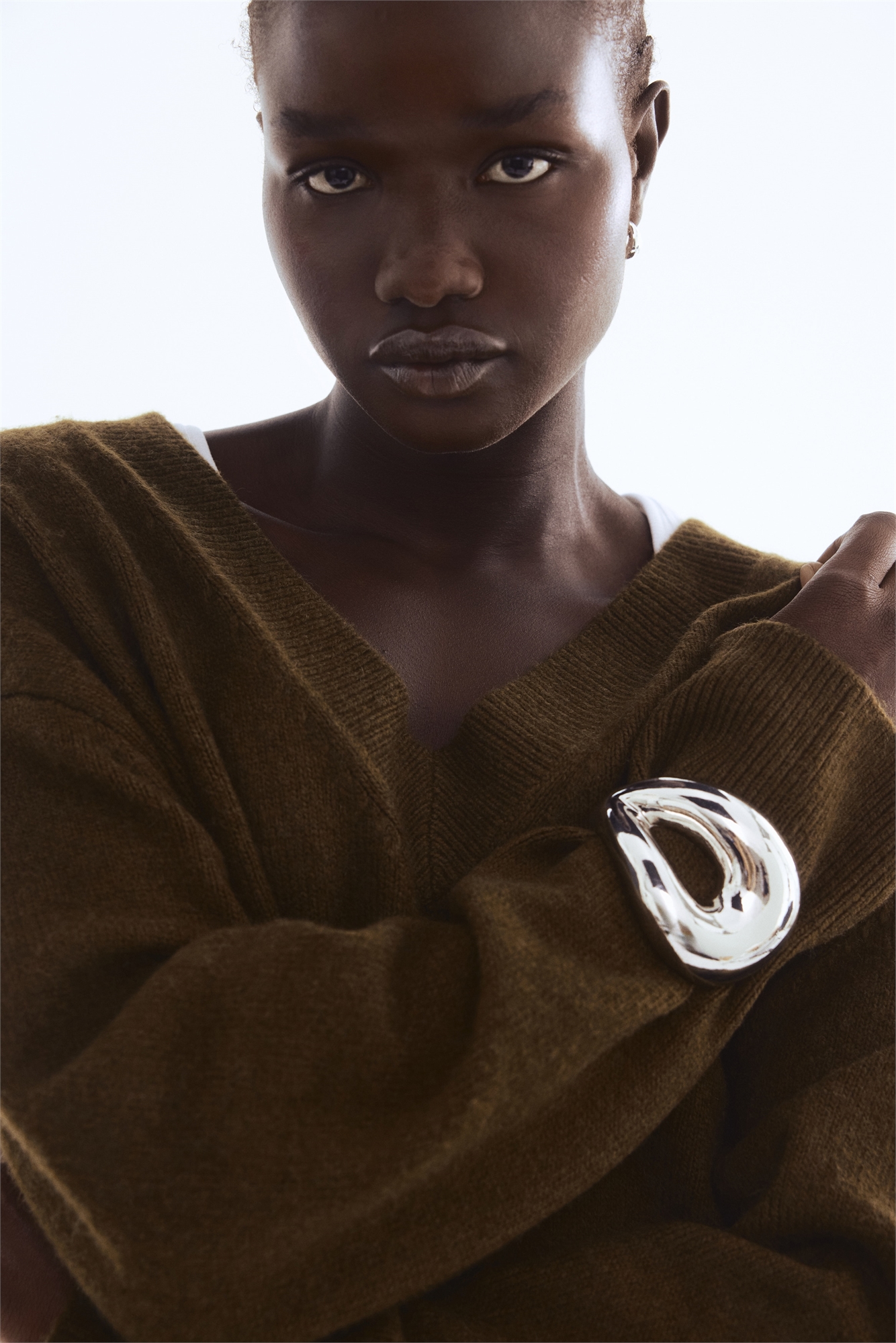 Джемпер оверсайз из мягкого трикотажа с V-образным вырезом, спущенными плечами и длинными рукавами. Окантовка вокруг выреза, на манжетах и подоле.