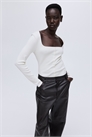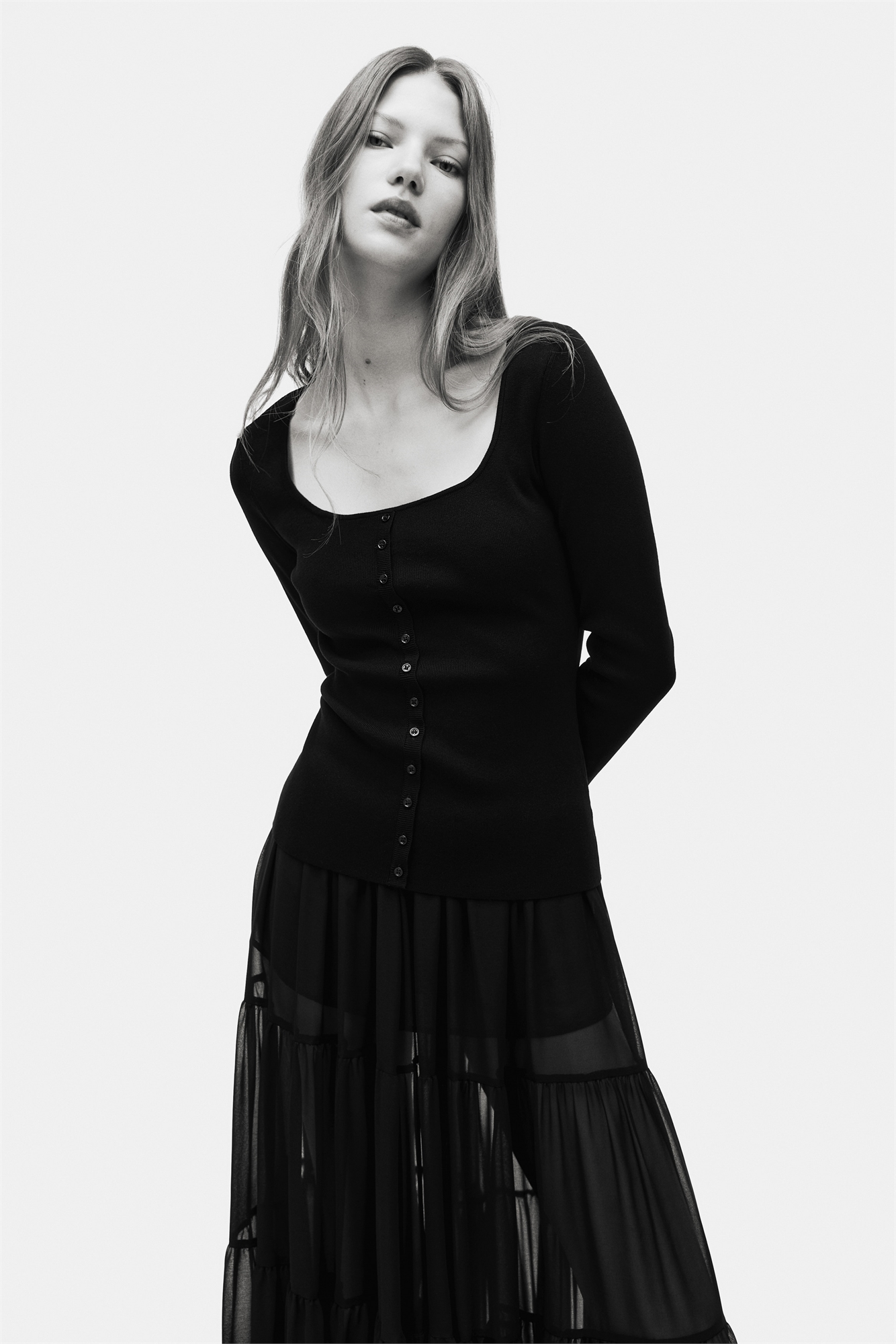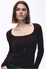 Облегающий топ с длинными рукавами из тонкого трикотажа с глубоким квадратным вырезом и декоративной планкой на пуговицах спереди.