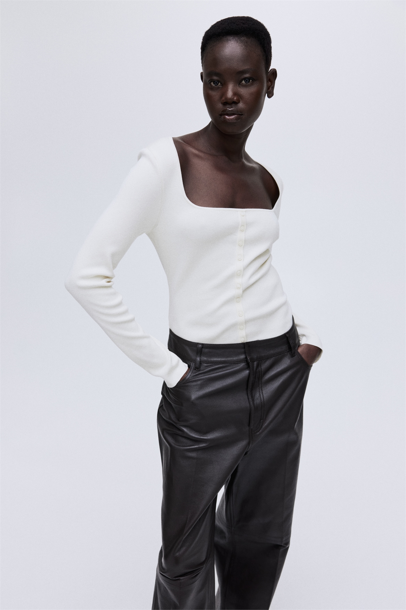 Облегающий топ с длинными рукавами из тонкого трикотажа с глубоким квадратным вырезом и декоративной планкой на пуговицах спереди.