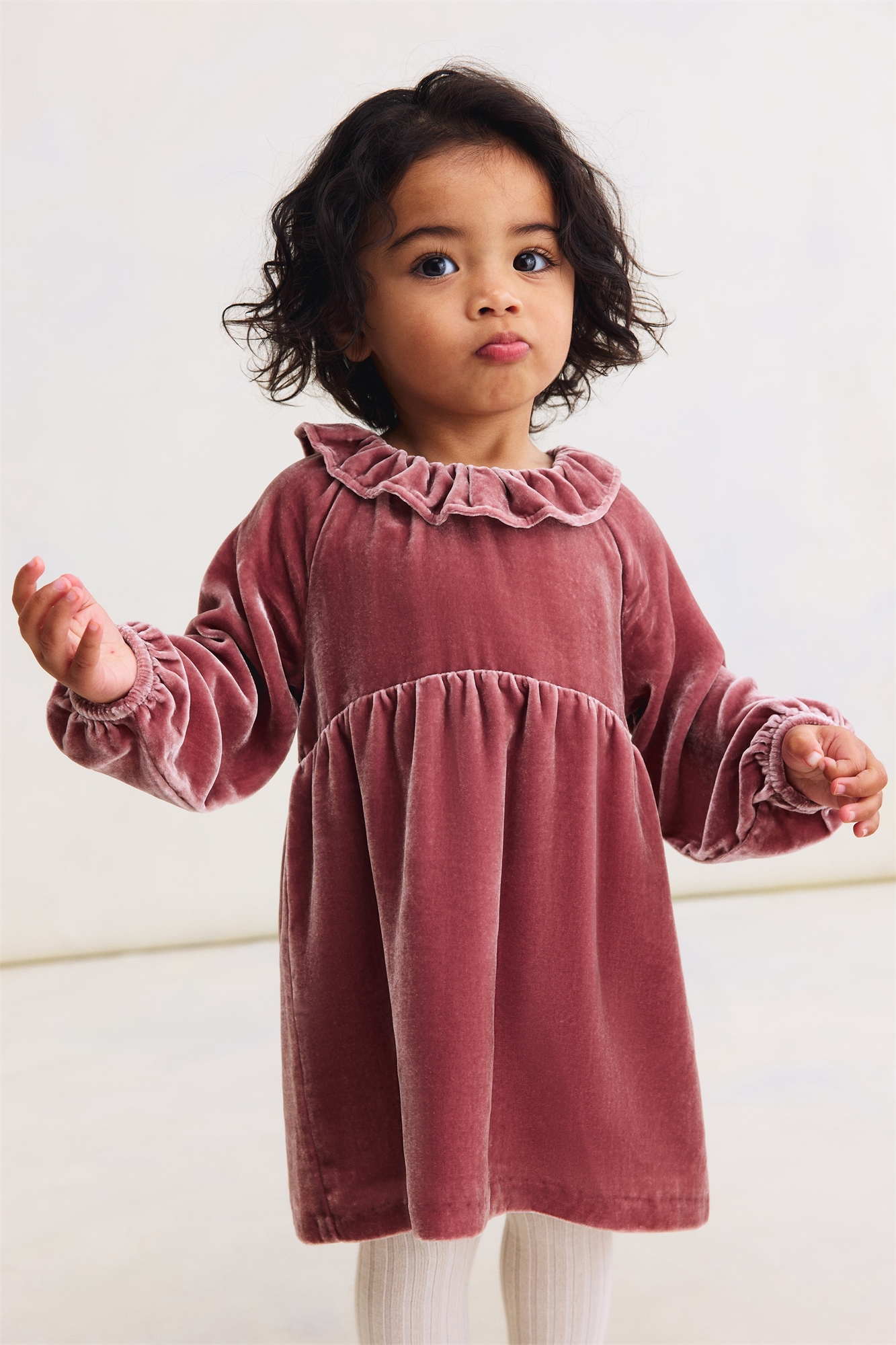 H&M Adorables. Платье из мягкого велюра из смеси вискозы и шелка. Круглый вырез с оборками, застежка на кнопки сзади и длинные рукава с узкими эластичными манжетами. Изогнутый шов со складками на талии и расклешенная юбка. Коллекция H&M Adorables - это подборка удобных и качественных вещей, не теряющих актуальности.
