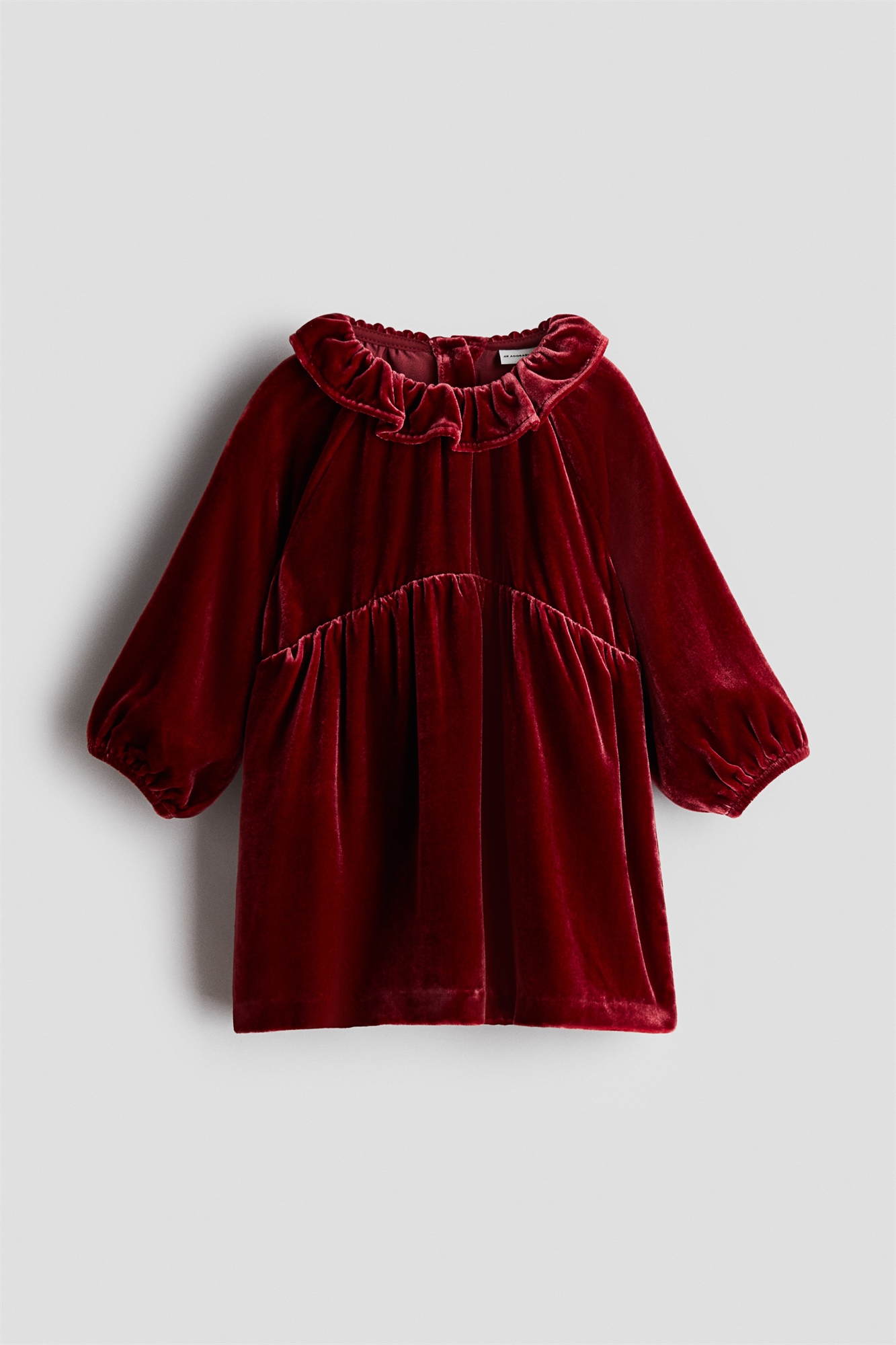H&M Adorables. Платье из мягкого велюра из смеси вискозы и шелка. Круглый вырез с оборками, застежка на кнопки сзади и длинные рукава с узкими эластичными манжетами. Изогнутый шов со складками на талии и расклешенная юбка. Коллекция H&M Adorables - это подборка удобных и качественных вещей, не теряющих актуальности.