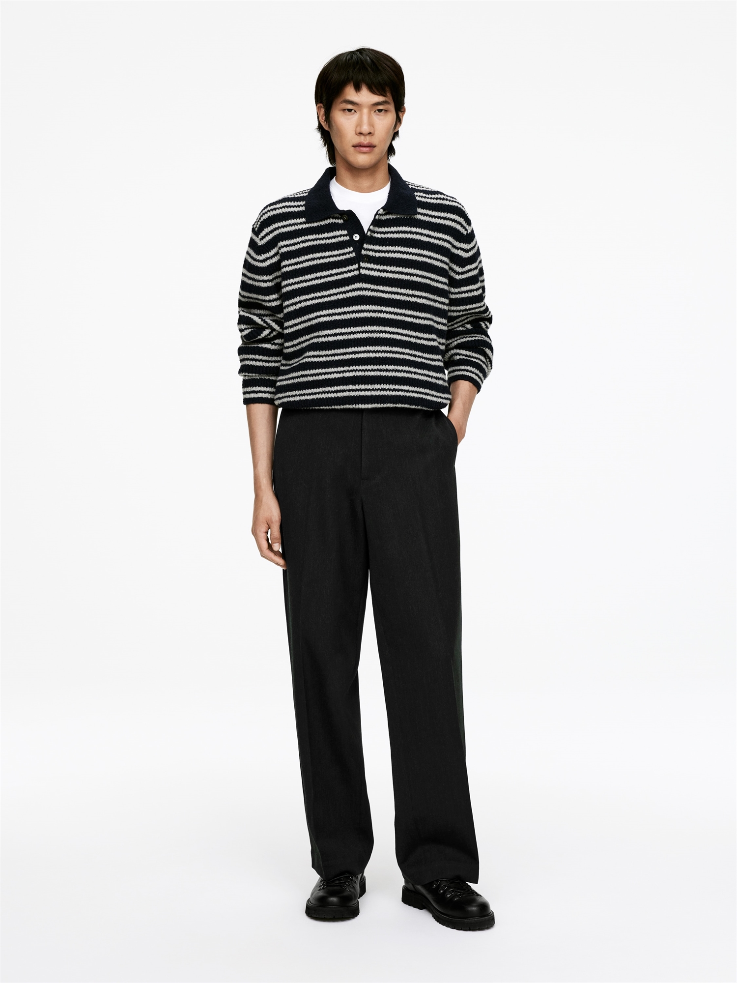 Нарядные шерстяные брюки свободного кроя. Модель с заутюженными складками, боковыми карманами и двумя втачными карманами с застежкой на пуговицы сзади. Застежка на крючок и ширинку на молнии. Изделие содержит 100% шерсти RWS (TE-00047206). Изделия, сертифицированные по стандарту ответственной шерсти (RWS), содержат шерстяное волокно с ферм, прошедших независимую сертификацию на соответствие требованиям по благополучию животных и землепользованию.