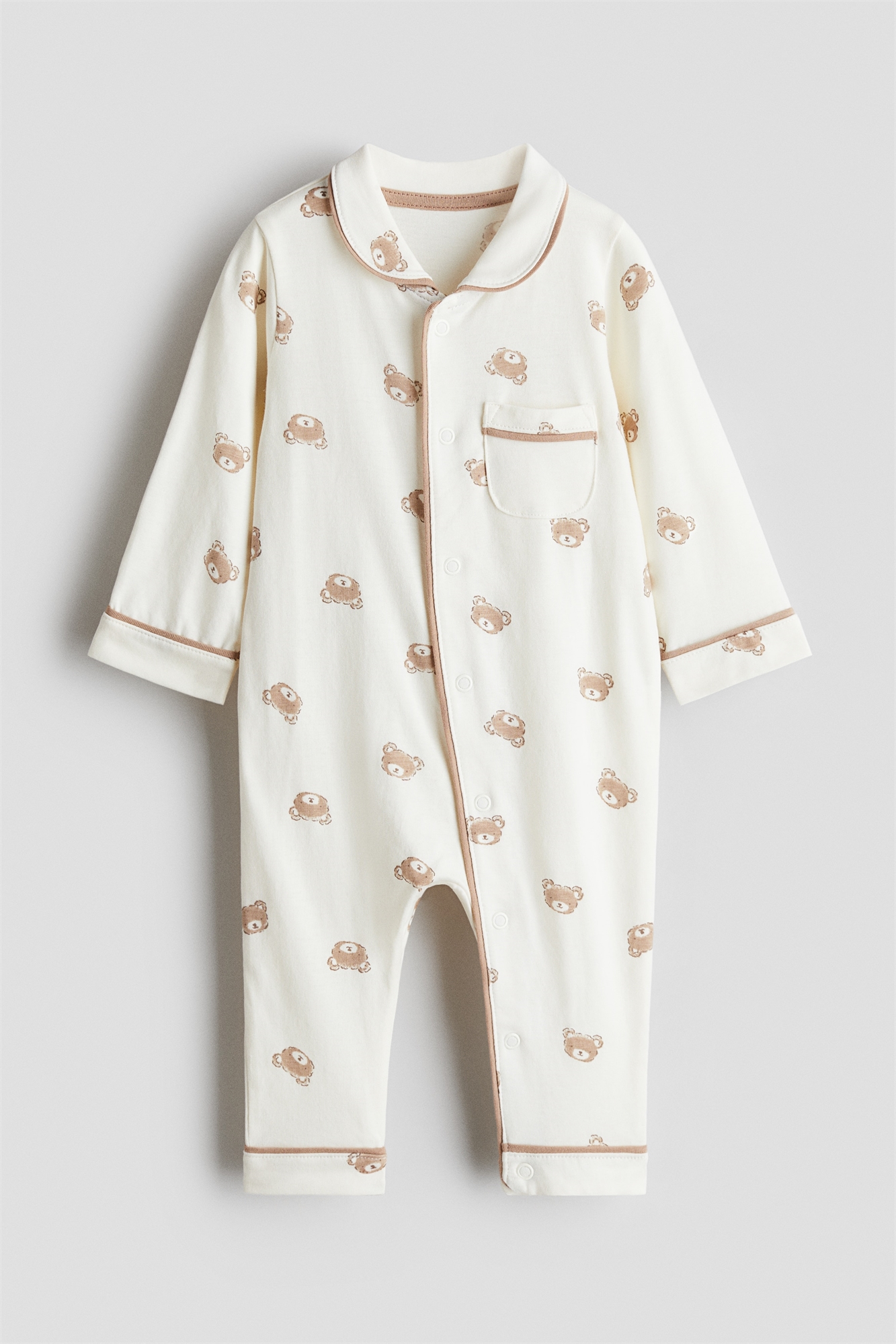 Спальный костюм из мягкого хлопкового джерси с принтом по всей поверхности и контрастной цветной отделкой. Закругленный воротник, открытый нагрудный карман, застежки спереди и вдоль одной штанины.