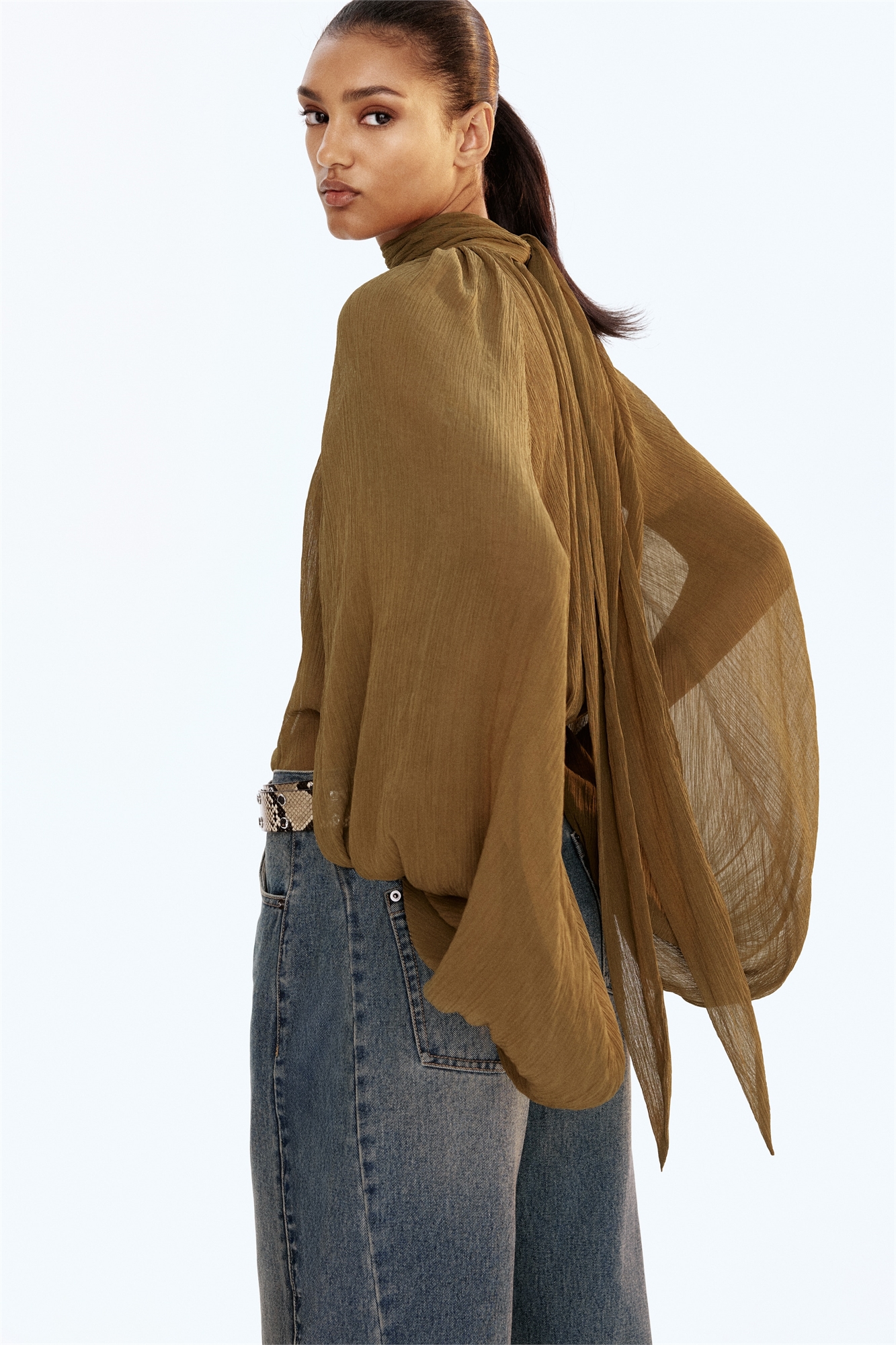 Блузка оверсайз из гладкокрашеного полотна с драпированным воротником-стойкой, V-образной проймой и длинными струящимися завязками сзади. Завязки спереди на шее и длинные рукава реглан с открытой штаниной и эластичными манжетами.