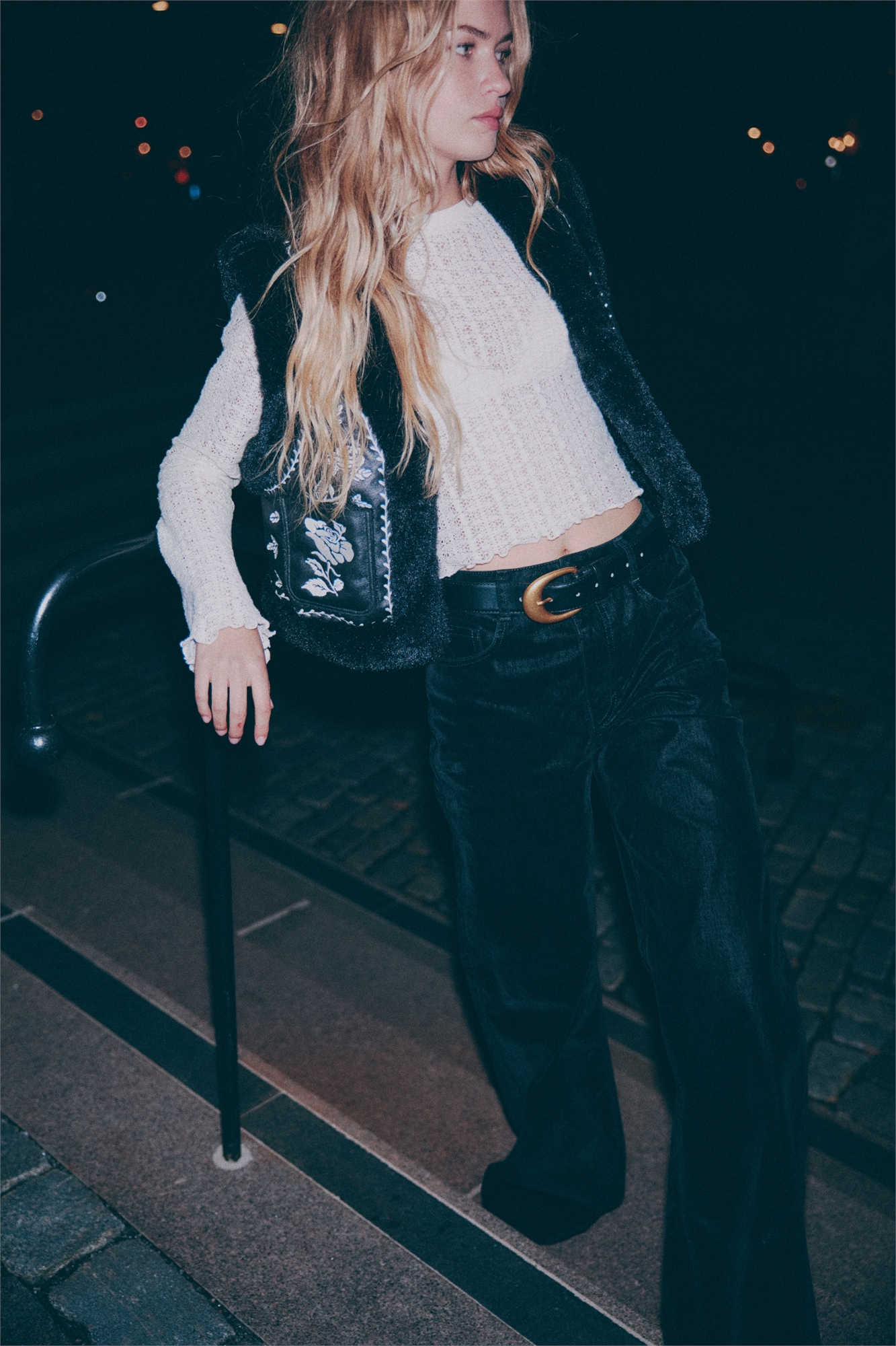 Жилетка из мелованной ткани с вышитыми мотивами и пушистой отделкой по краям. V-образный вырез, накладные передние карманы и открытая передняя часть.