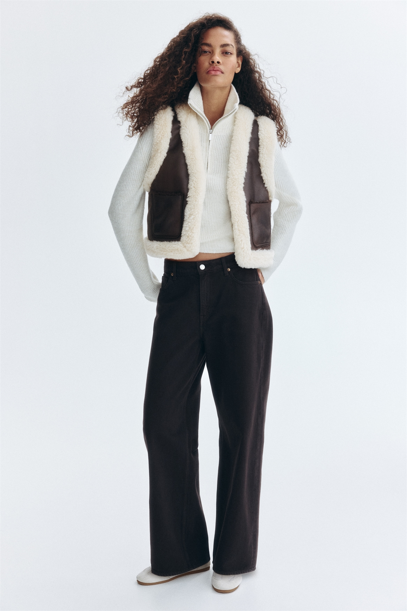 Жилетка из мелованной ткани с вышитыми мотивами и пушистой отделкой по краям. V-образный вырез, накладные передние карманы и открытая передняя часть.