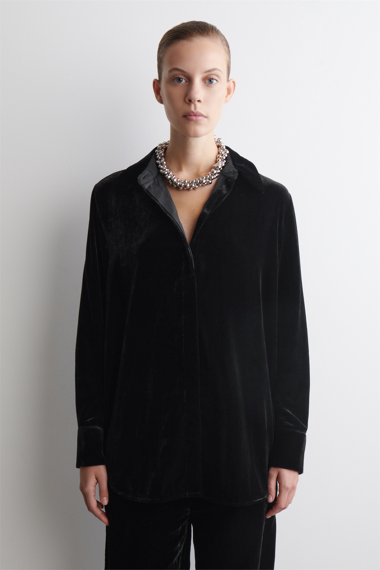 Эта рубашка из роскошного нескользящего бархата шоколадно-коричневого цвета идеально подходит для особых случаев. Она имеет свободный силуэт, заостренный воротник, потайные пуговицы и складку сзади. Носите с подходящими брюками. Свободный кройПуговицыПереработанный полиамид - полиамид, изготовленный из остатков текстиля, оставшегося после производства Внешний материал: 77% вискоза, 22% переработанный полиамид (переработанный нейлон). Детали исключены/Сухая чистка Длина по спинке в размере ЕС 36 = 75,1 см/Модель носит размер ЕС 36