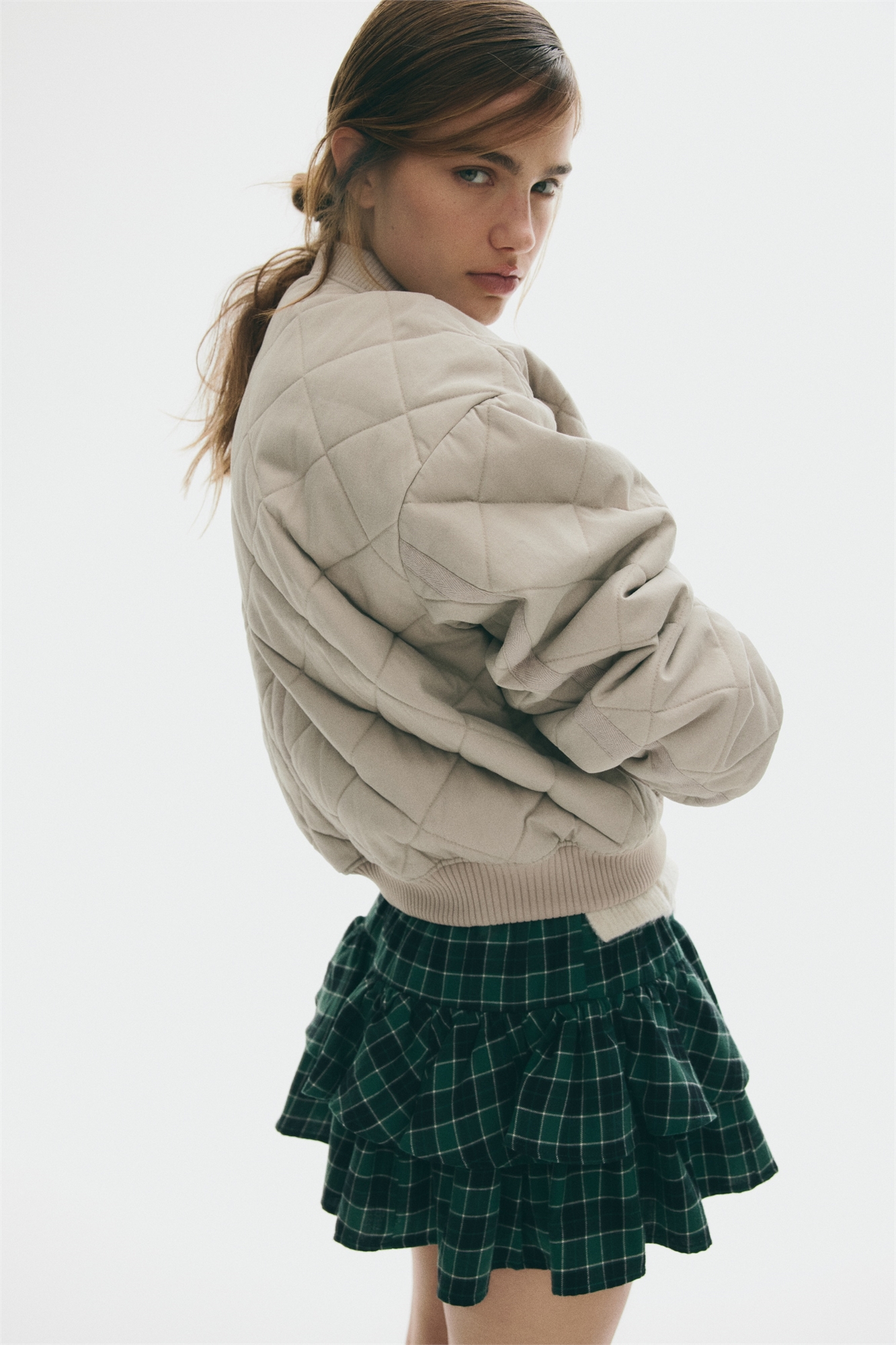 Негабаритная куртка-бомбер с легкой подкладкой из стеганого материала. Низкий ребристый воротник и застежки на кнопках спереди. Накладные передние карманы, спущенные плечи, манжеты и подол в рубчик. На подкладке.