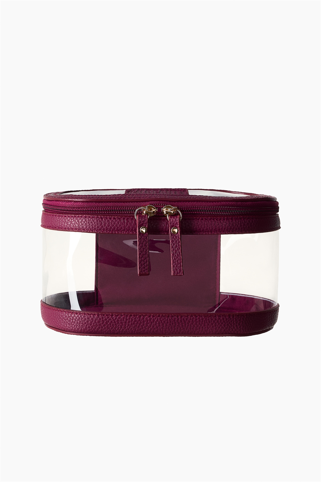 Овальная косметичка с прозрачным дизайном, позволяющим хорошо рассмотреть содержимое. С цветными деталями из ткани с покрытием и крышкой на молнии. Глубина 11 см. Высота 11,5 см. Ширина 21 см.