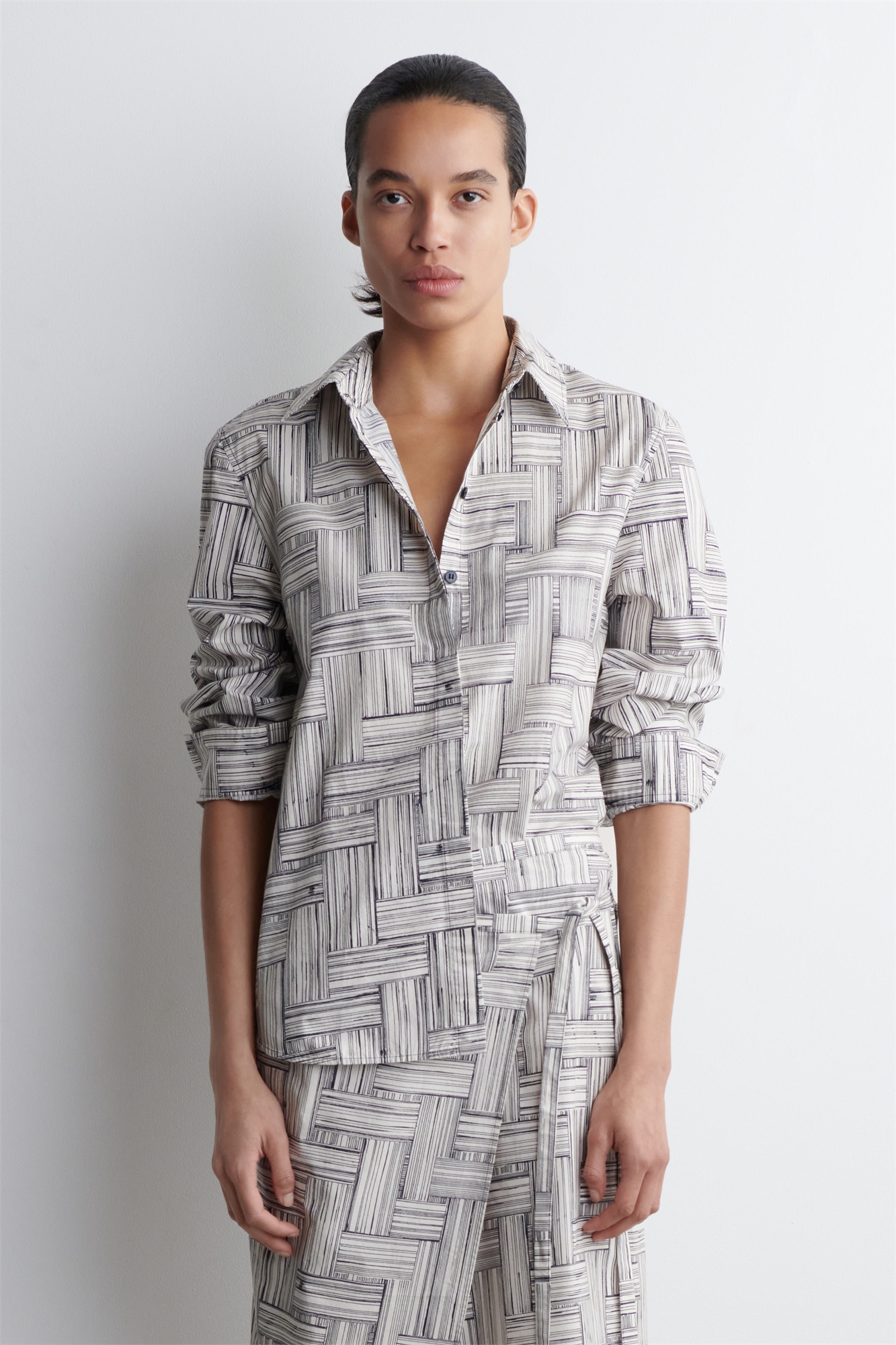 Изготовленная из мягкого хлопка, эта изысканная рубашка классического силуэта с заостренным воротником и потайной застежкой. Она украшена фирменным мотивом "плетение корзин", созданным путем прослеживания тонких линий бумажного одеяла, сотканного вручную. Подберите к нему подходящую юбку. Regular fitЗастежка на пуговицы Материал: 100% хлопок. Без учета отделки / Машинная стирка Длина по спинке для размера EU 36 составляет 70,8 см / Модель носит размер EU 36