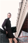 Короткое приталенное платье из саржи с круглым вырезом и тонкими подплечниками. Длинные рукава с разрезом на манжетах, талиевые вытачки спереди и сзади и втачные передние карманы с клапаном. Потайная застежка-молния сзади. На подкладке.