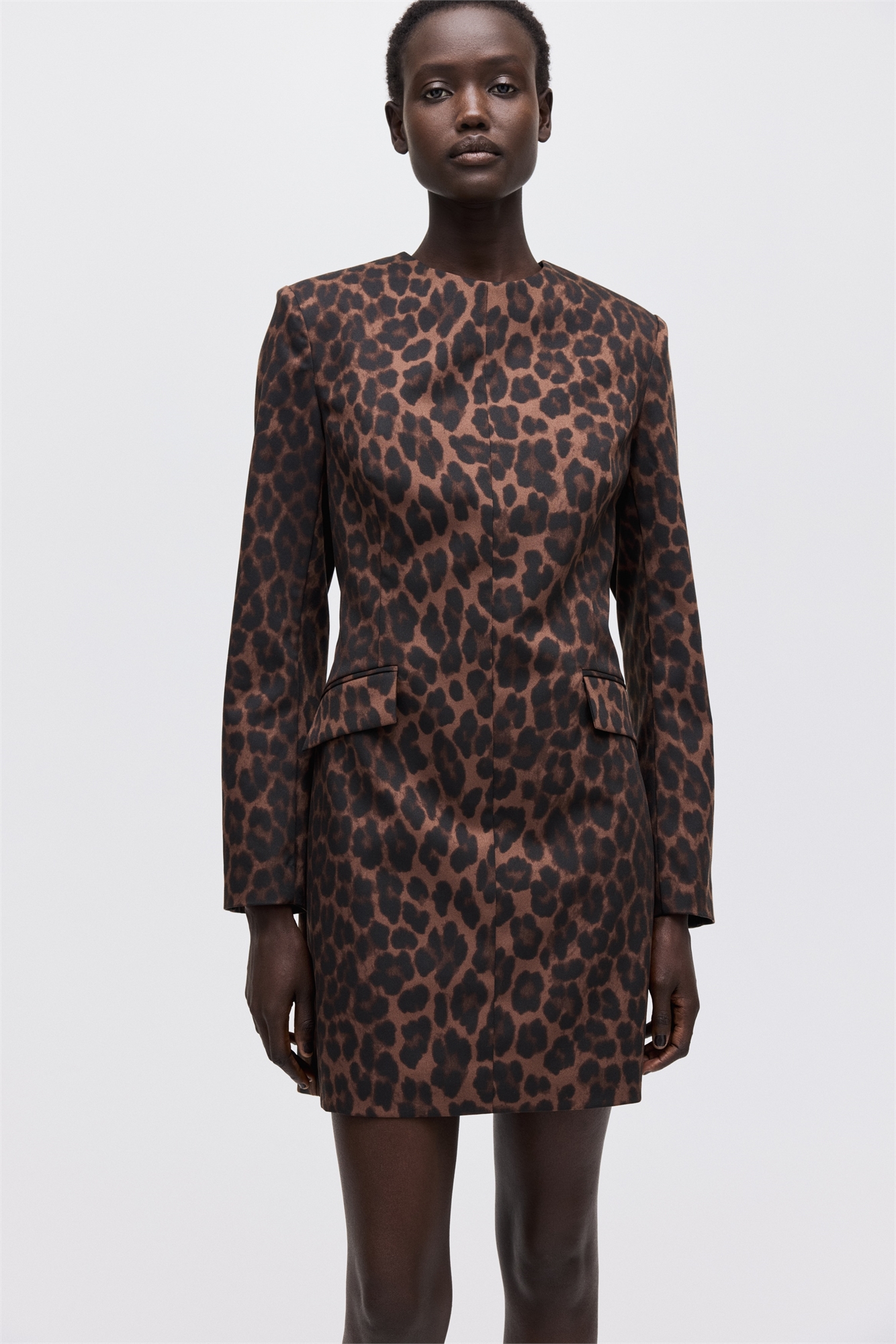 Короткое приталенное платье из саржи с круглым вырезом и тонкими подплечниками. Длинные рукава с разрезом на манжетах, талиевые вытачки спереди и сзади и втачные передние карманы с клапаном. Потайная застежка-молния сзади. На подкладке.