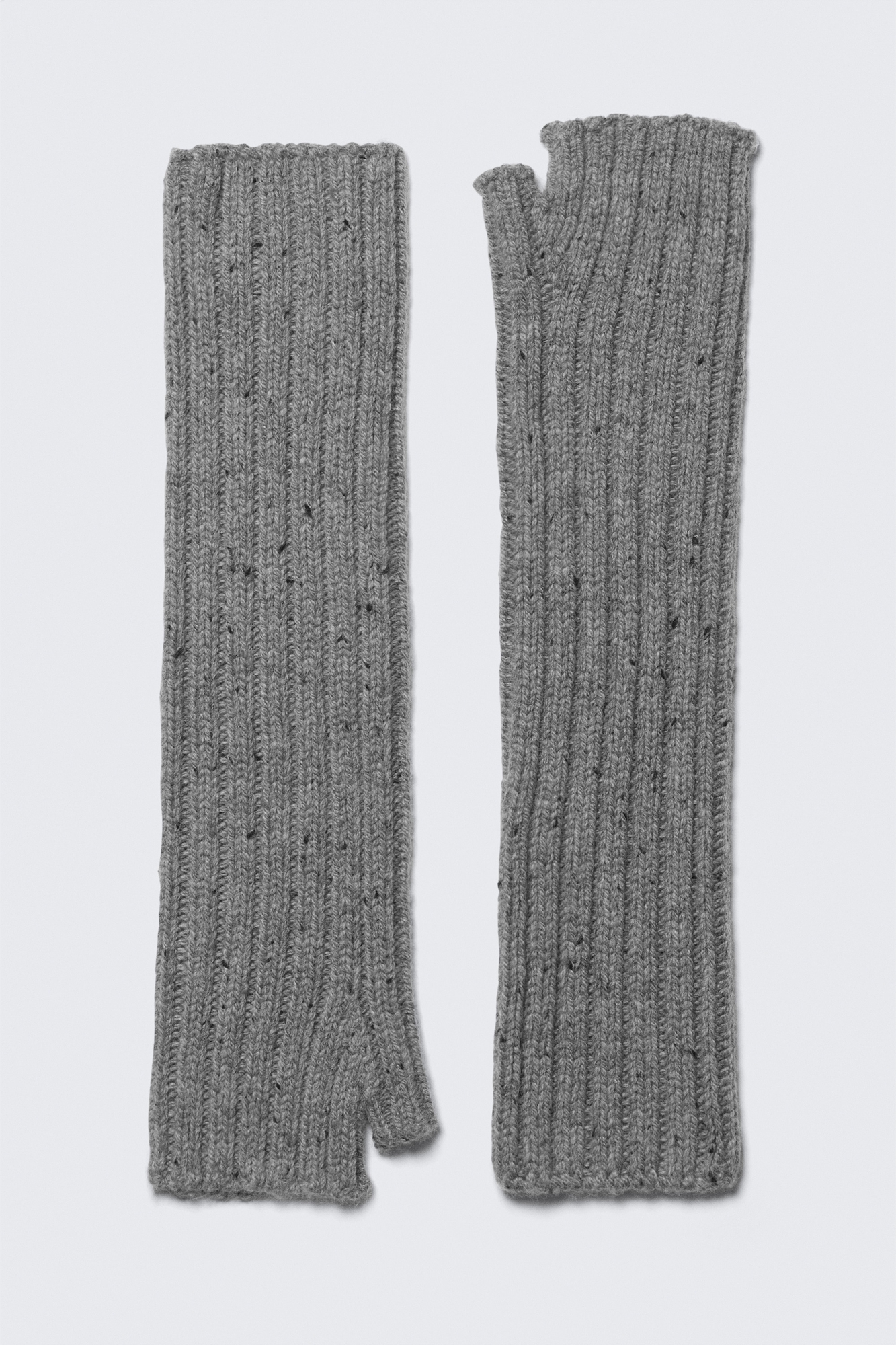 Пара длинных грелок для запястий с ребристыми деталями и отверстиями для пальцев, обеспечивающими свободу движений. Изготовлены из переработанного полиэстера и шерсти.