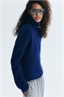 Джемпер свободного кроя из мягкого трикотажа в рубчик с воротником-стойкой и застежкой-молнией в верхней части. Спущенные плечи и длинные рукава.