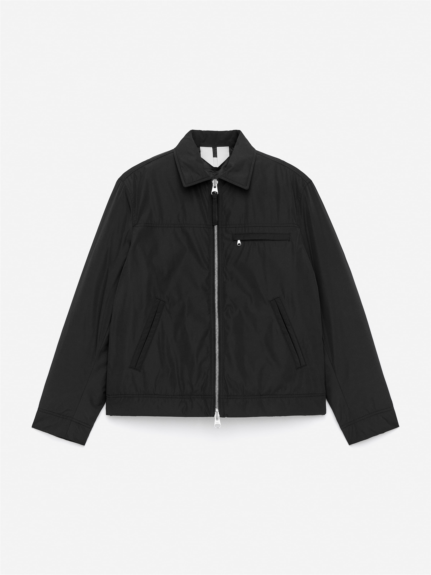 Нейлоновая куртка с стеганой подкладкой. Крой прямого силуэта, стандартный воротник, застежка-молния спереди и карманы с застежкой-молнией. Застежки-кнопки на подоле. Манжеты на пуговицах. Один внутренний карман с застежкой-молнией.