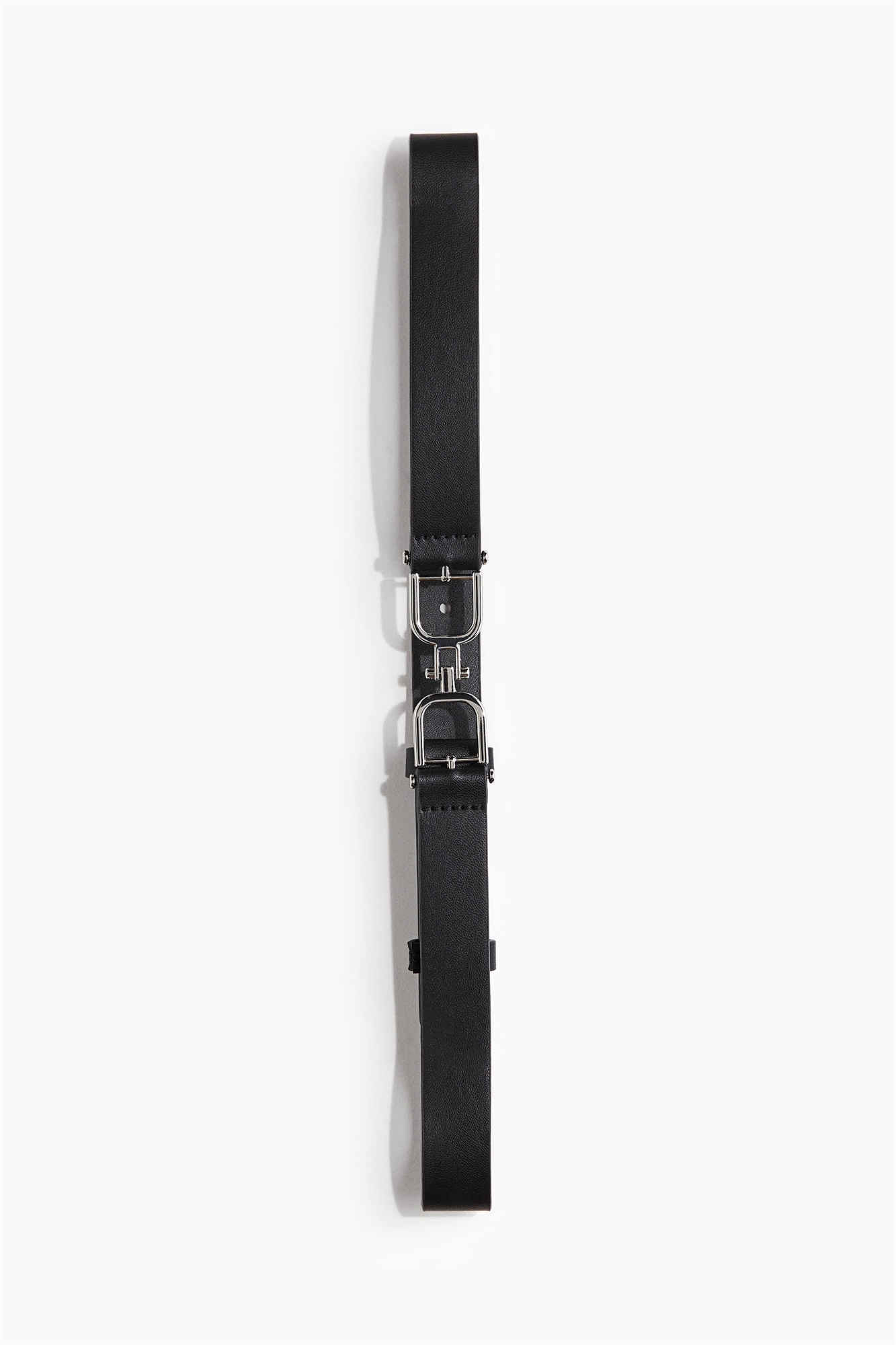 Узкий пояс из ткани с покрытием, декоративная металлическая пряжка спереди и регулируемая застежка-шпилька сзади.