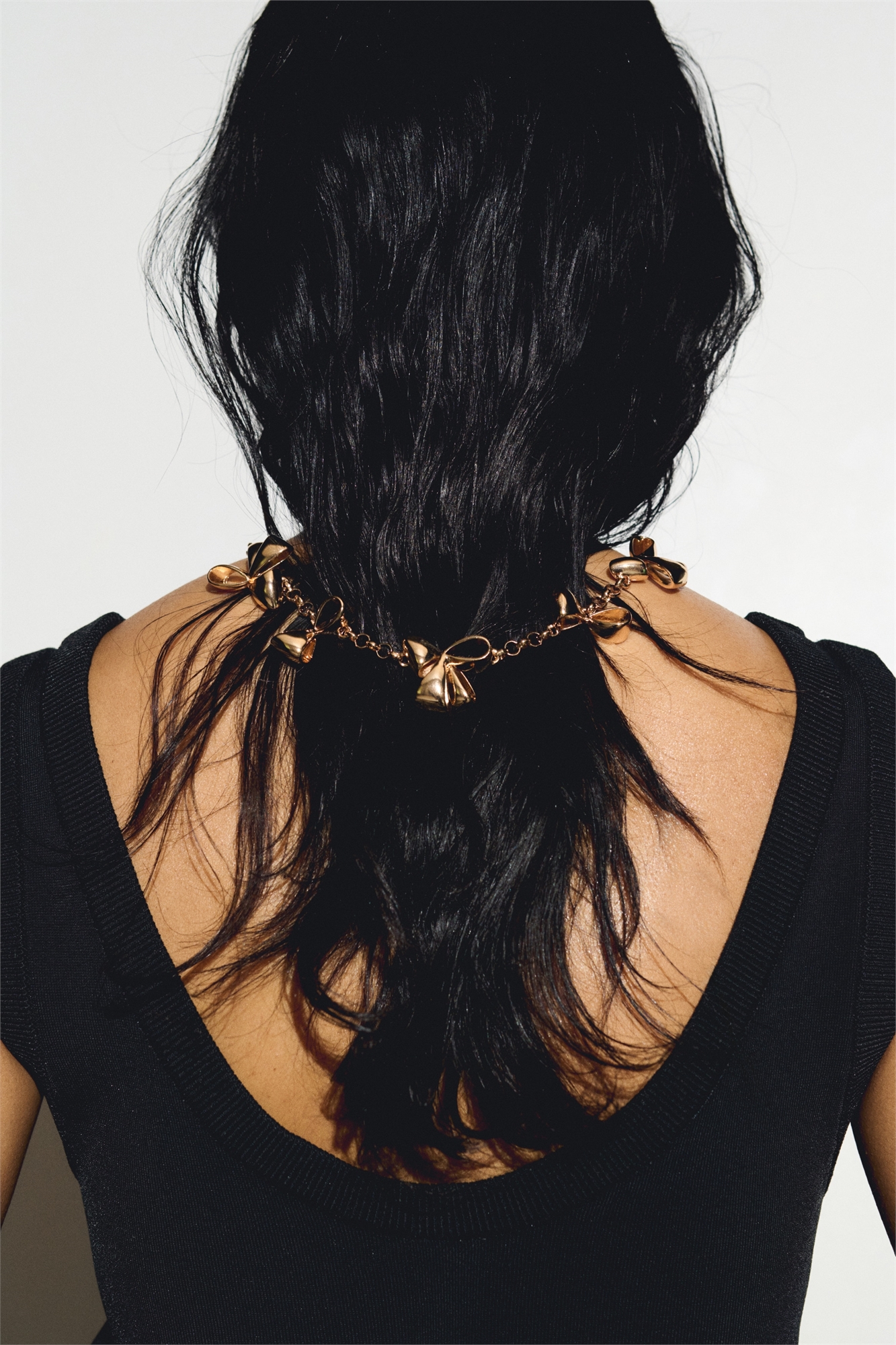 Ожерелье на металлической цепочке, украшенное подвесками в форме бантов. Застежка-тумблер.