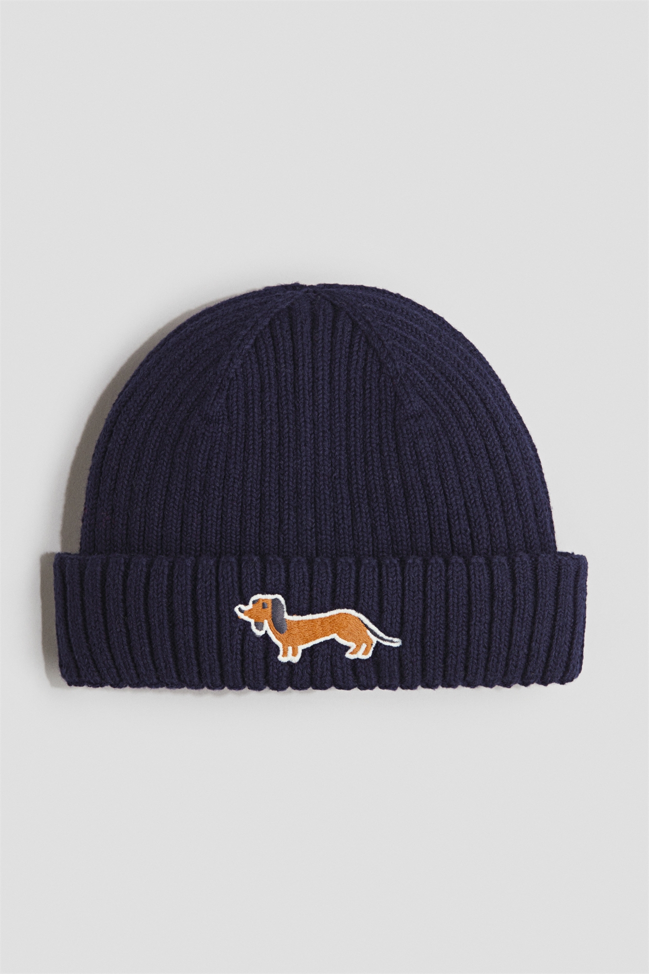 Бини из мягкого трикотажа в рубчик с аппликацией спереди и подвёрнутым подолом.