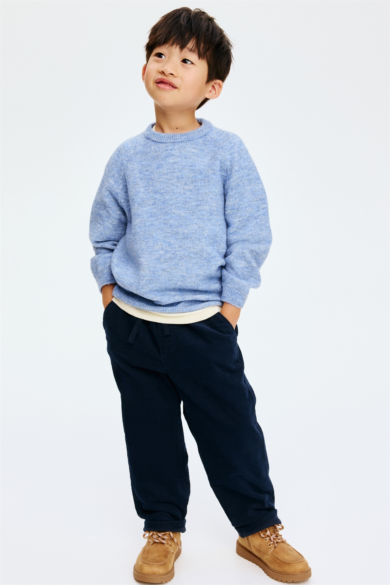Брюки из мягкого хлопкового вельвета с подкладкой из джерси. Свободный крой по бедрам и ляжкам, слегка зауженные ноги. Эластичный пояс с завязками, фальшивая ширинка, боковые карманы и открытый задний карман.