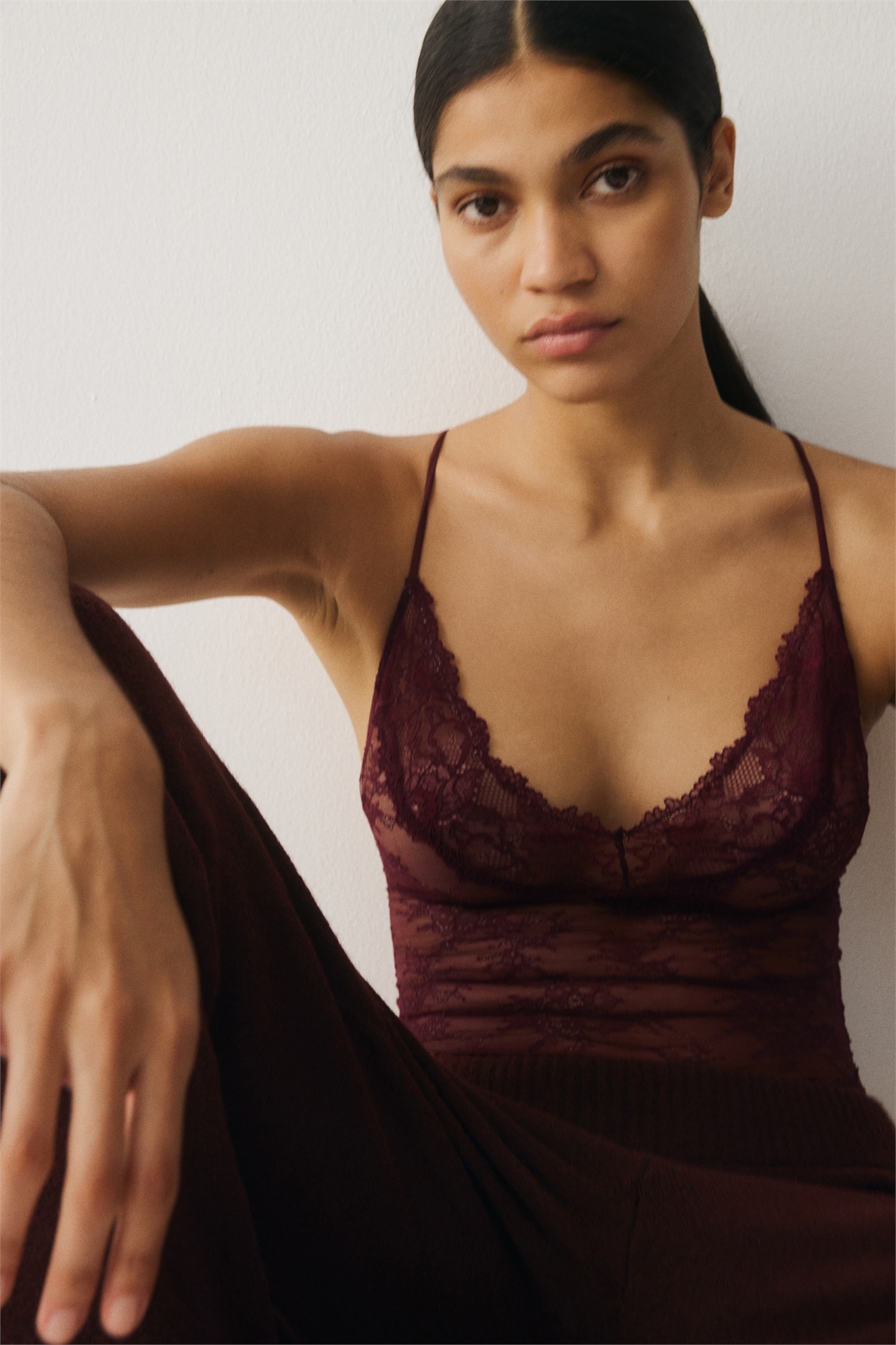 Боди с V-образным вырезом из кружева с бретелями-спагетти, которые перекрещиваются, продеваются через маленькие петельки и завязываются сзади. Ластовица на подкладке с потайными кнопками и высоким разрезом сзади.