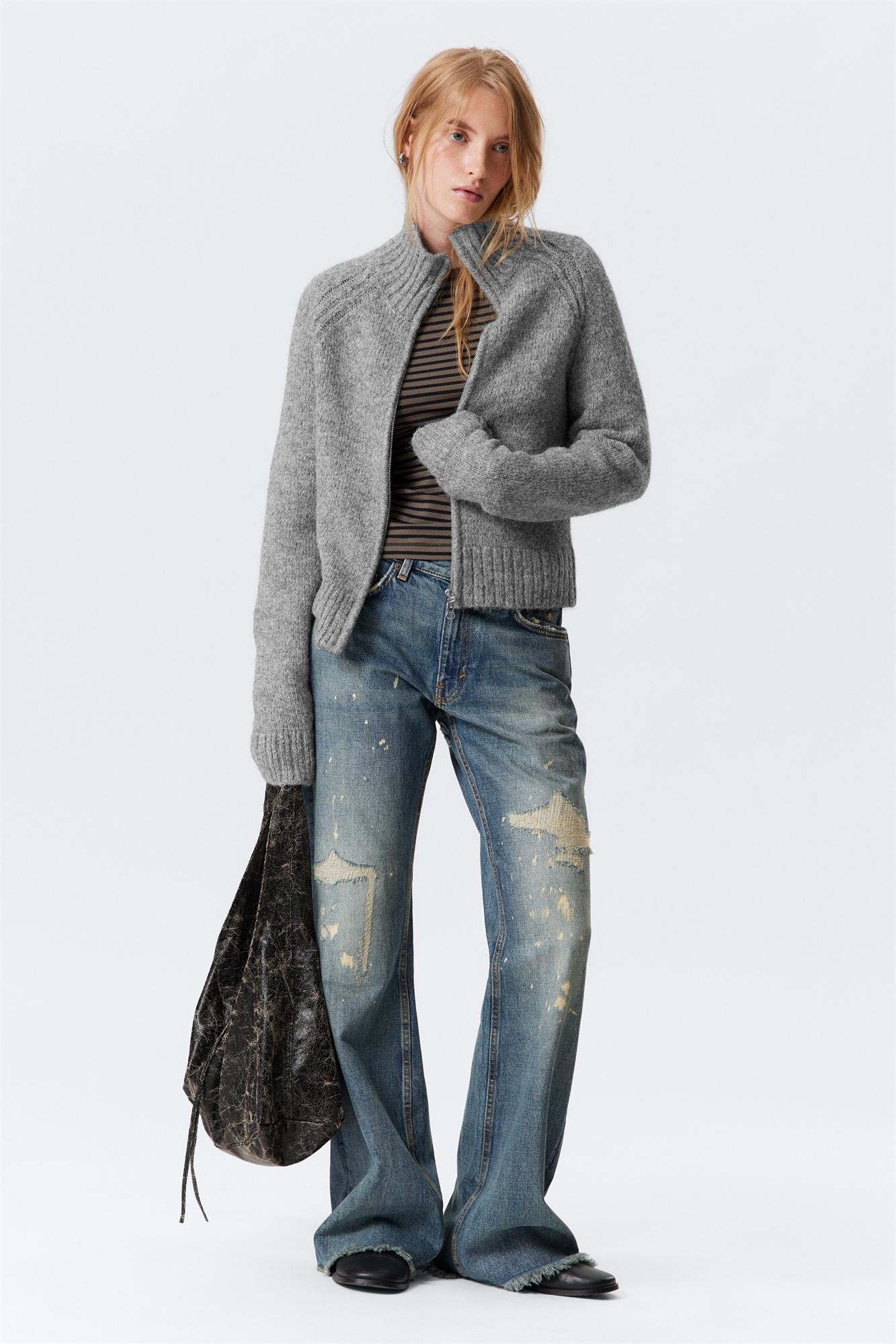 Облегающий кардиган на молнии, вязаный из мягкой фактурной пряжи. Кардиган с рукавами реглан и высоким ребристым воротником застегивается на двустороннюю молнию, имеет широкие ребристые манжеты и полностью обработанные детали. Чистые линии и облегающий силуэт делают его универсальным вариантом одежды.