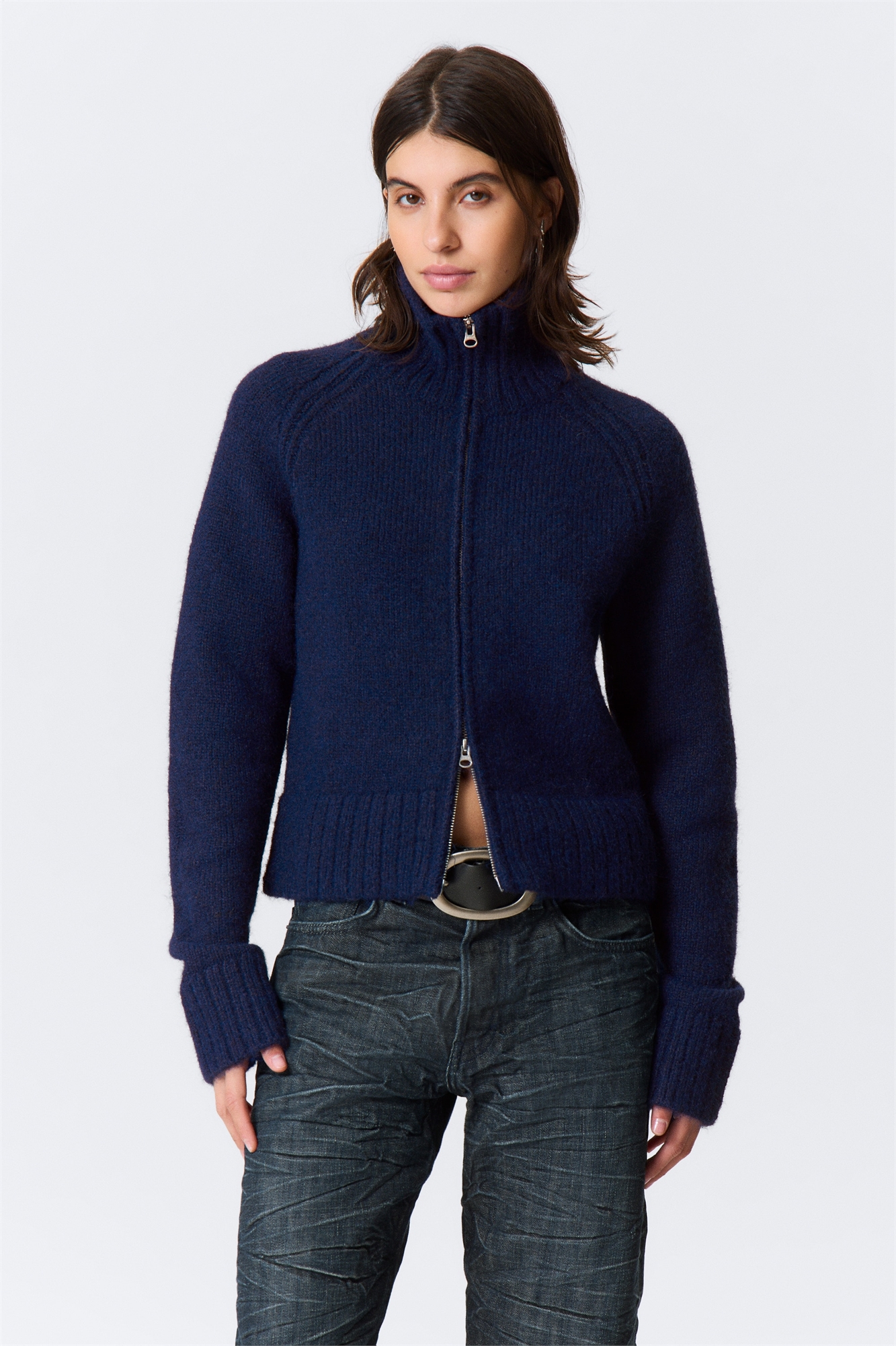 Облегающий кардиган на молнии, вязаный из мягкой фактурной пряжи. Кардиган с рукавами реглан и высоким ребристым воротником застегивается на двустороннюю молнию, имеет широкие ребристые манжеты и полностью обработанные детали. Чистые линии и облегающий силуэт делают его универсальным вариантом одежды.