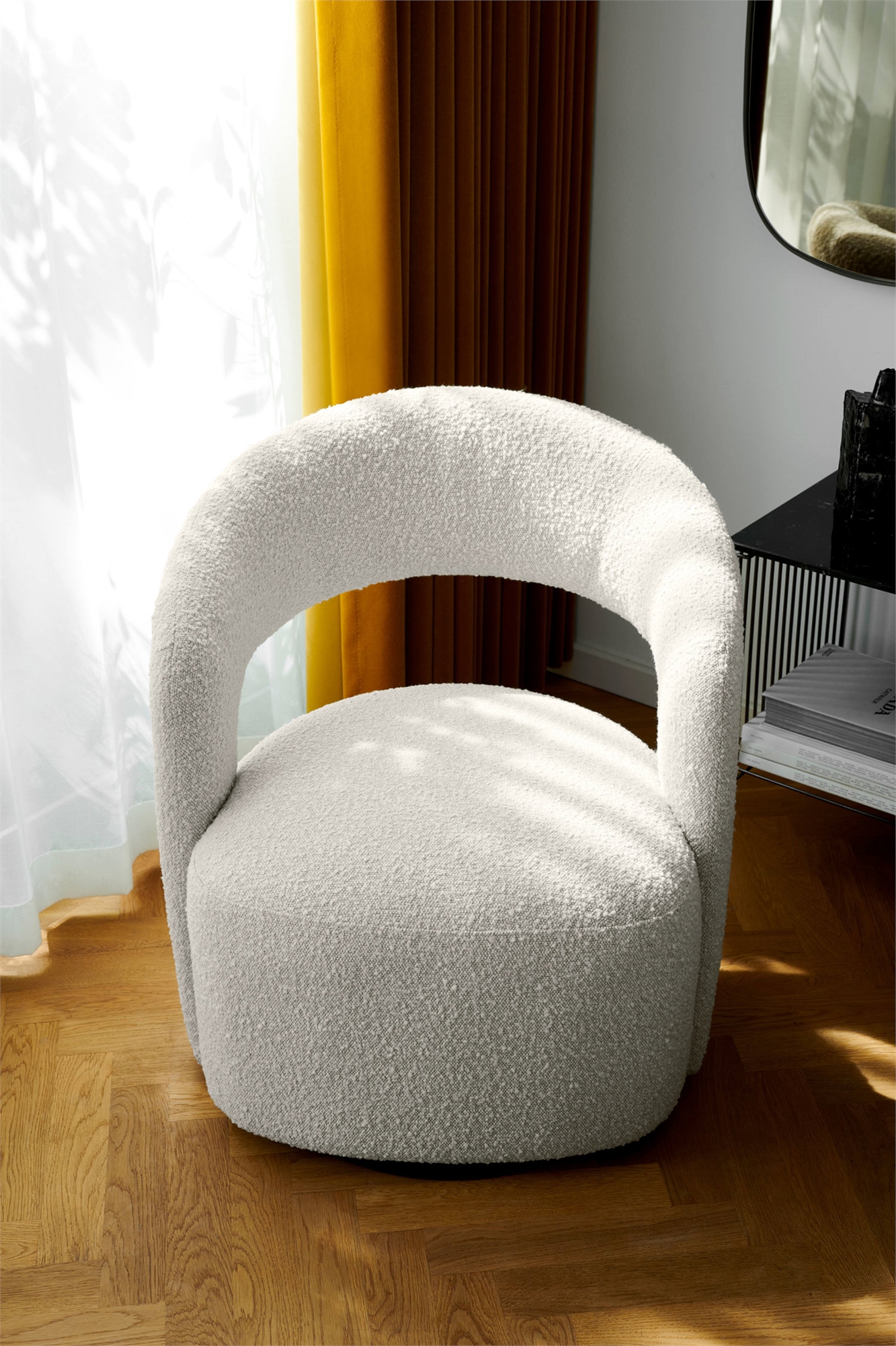 Кресло Judi от SOFACOMPANY имеет гламурный и элегантный дизайн с ярким выражением. Воздушная спинка обрамляет сиденье и придает креслу легкий вид. Под креслом находится незаметное поворотное основание, которое позволяет вращаться на 360 градусов. Judi обито тканью букле светлого цвета.