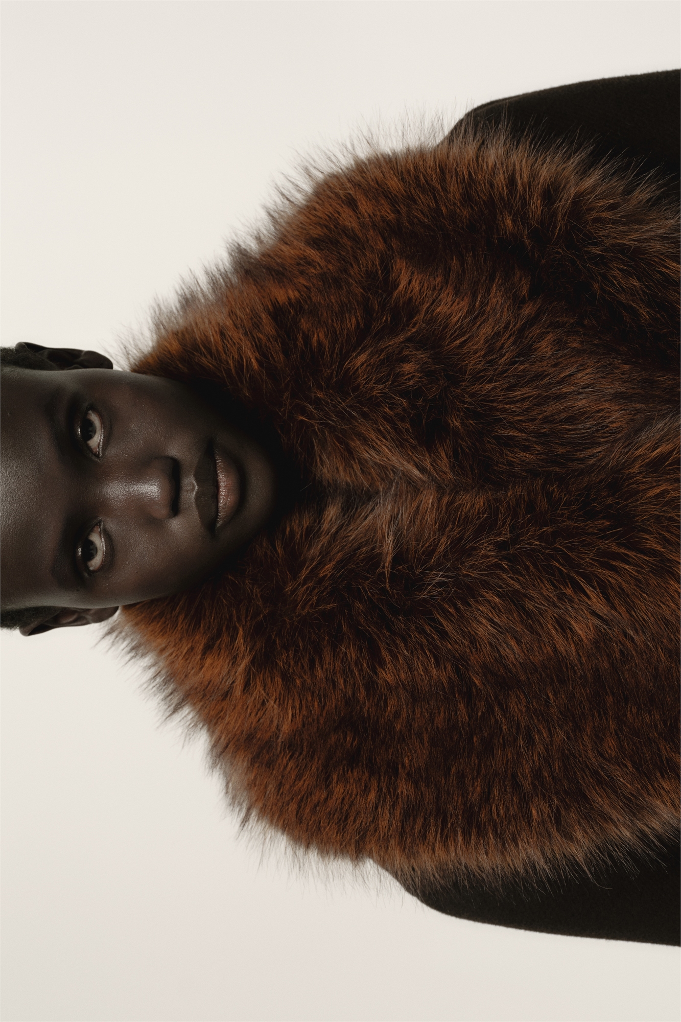 Двубортное пальто длиной до колен из тканого материала с добавлением шерсти. Съемный шалевый воротник из мягкой пушистой ткани и пуговицы спереди. Боковые карманы и один задний клапан. На подкладке.