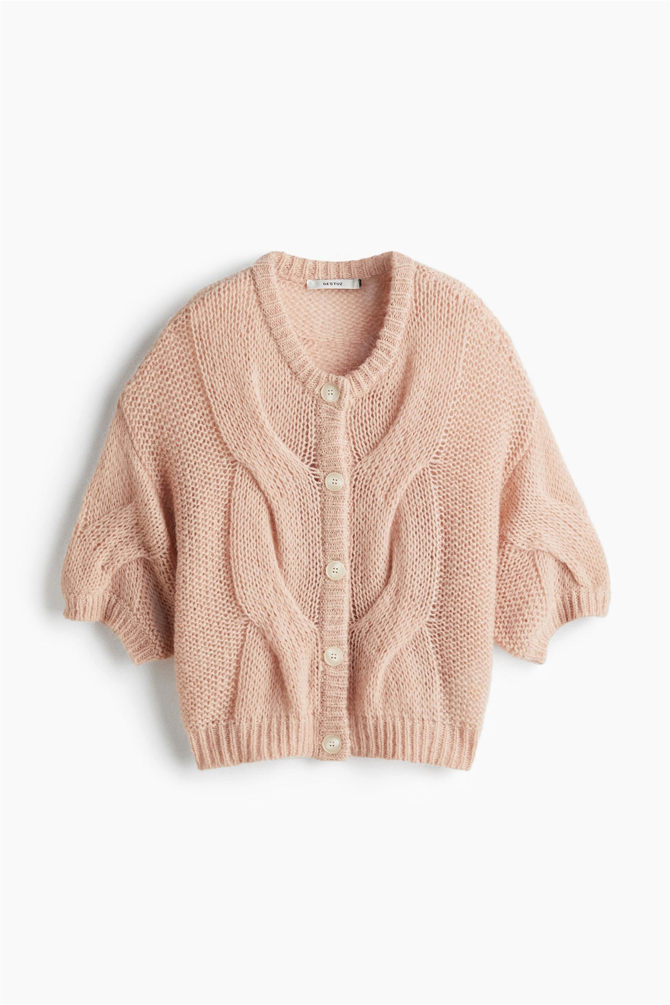 Вязаный кардиган из смеси мохера и шерсти. Кардиган имеет завышенный крой с длиной до бедер и рукавами длиной до локтя. Спереди застежка на пуговицы по всей длине. Кардиган, в котором вам будет уютно и тепло.