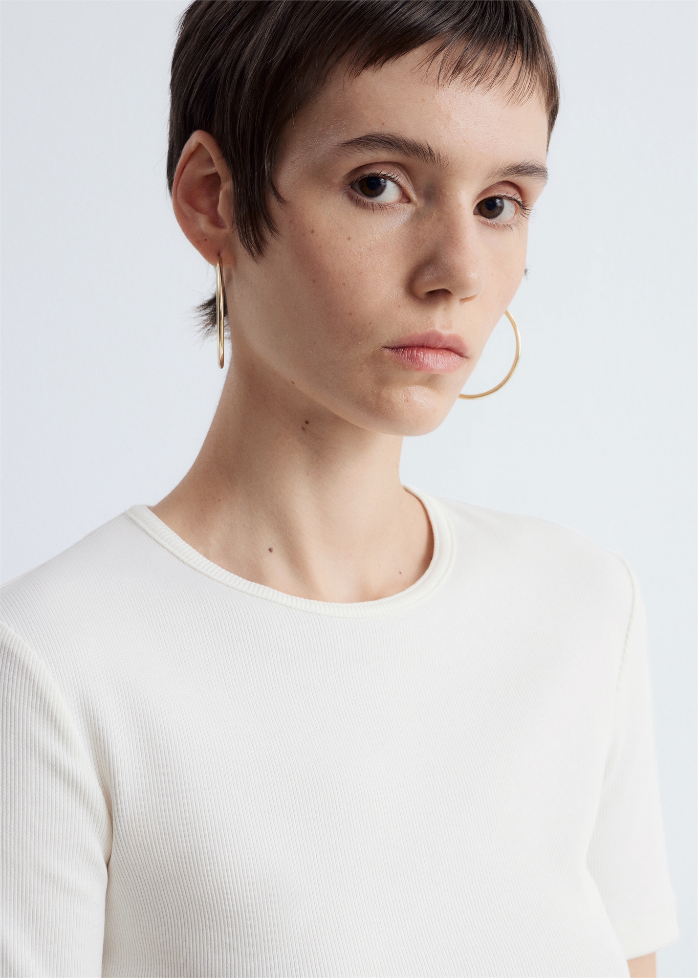 Эта футболка сшита из мягкого, эластичного хлопкового бленда в рубчик. Она имеет круглую горловину и короткие рукава. Носите с джинсами или мини-юбкой. Длина футболки: 55,5 см / 21,8" (размер S)