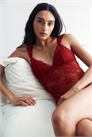 Кружевное боди стринги без проводов с V-образным вырезом, мягкими чашечками, придающими форму бюсту и обеспечивающими хорошую поддержку, и узкой эластичной окантовкой под бюстом с застежкой на крючки сзади. Открытая часть сзади и ластовица на подкладке с потайными кнопками.