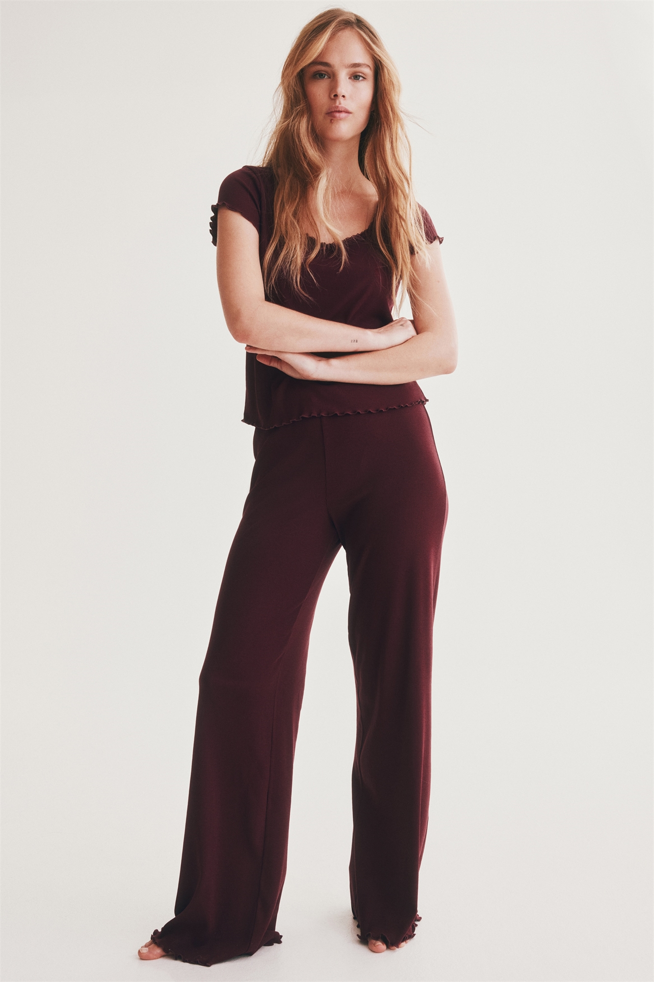 Пижама из мягкого ребристого трикотажа. Топ с короткими рукавами, глубоким вырезом с кружевной отделкой и оверлоком на манжетах и подоле. Низ с эластичной отделкой и декоративным атласным бантом на талии и прямые ножки с оверлоком по подолу.