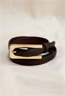 Узкий кожаный ремень с блестящей металлической пряжкой.