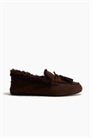 Тапочки с мягкой ворсистой отделкой, мокасиновым швом и декоративным бантом с кисточками спереди. Подкладка и стелька из пушистой ткани.