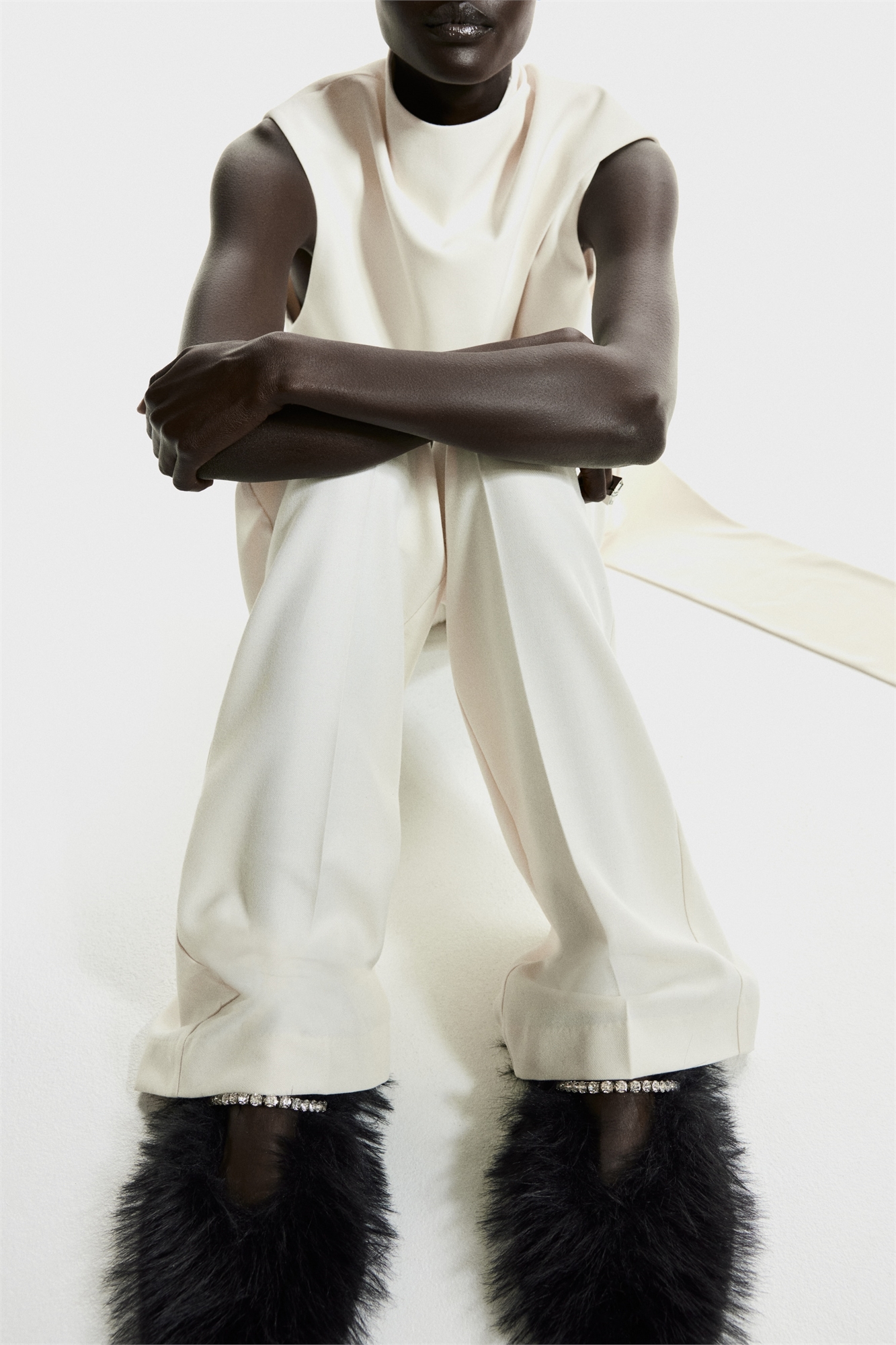 Тапочки из мягкой пушистой ткани с эластичным ремешком на ноге, украшенным сверкающими стразами. Атласная подкладка.