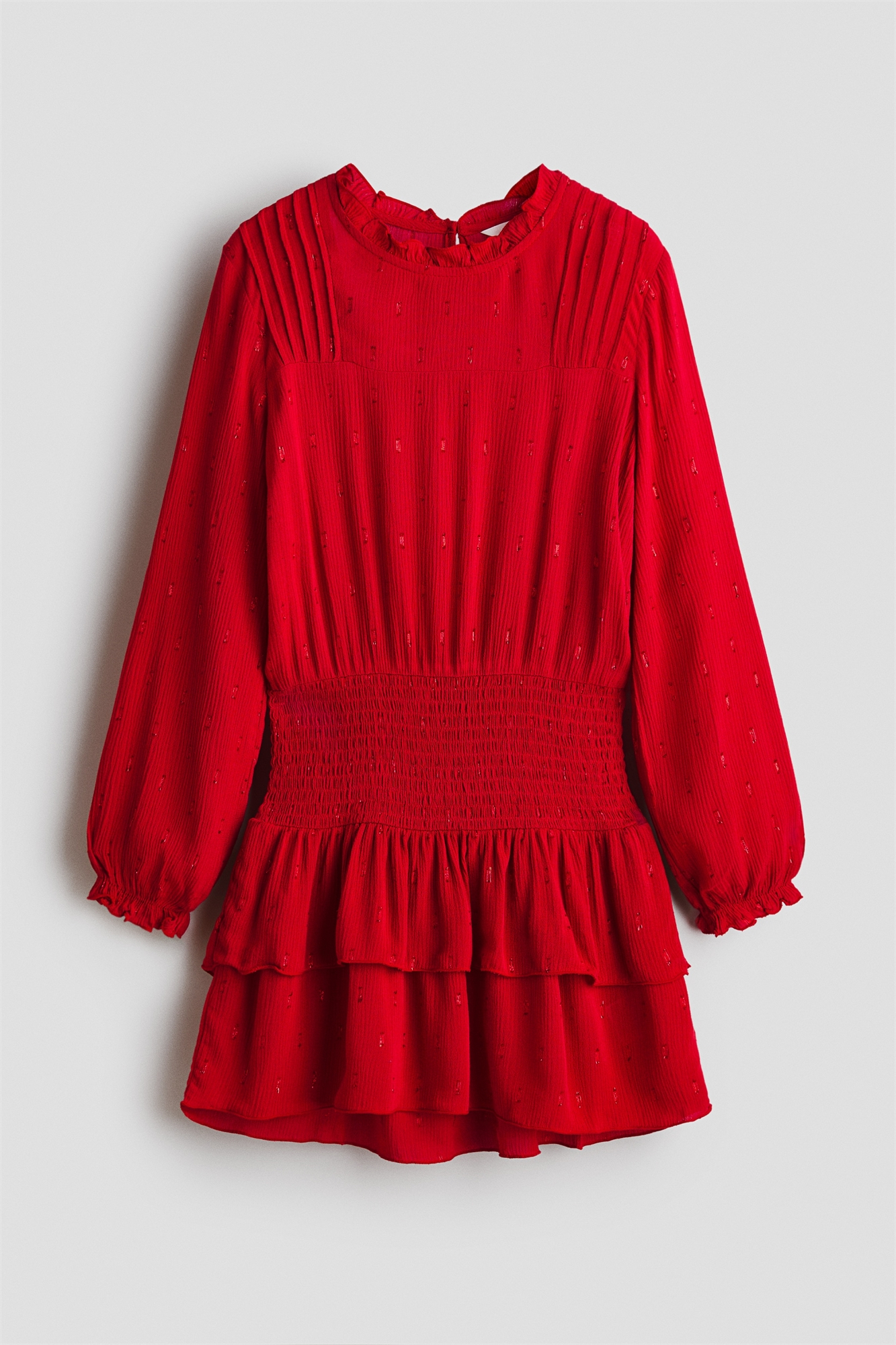 Платье из воздушного вискозного полотна с воротником с оборками и ярмом с пинтаками спереди. Отверстие для ключа с пуговицей сзади на шее и длинные рукава с эластичными манжетами с оборками. Завязки на талии и воланы на юбке.
