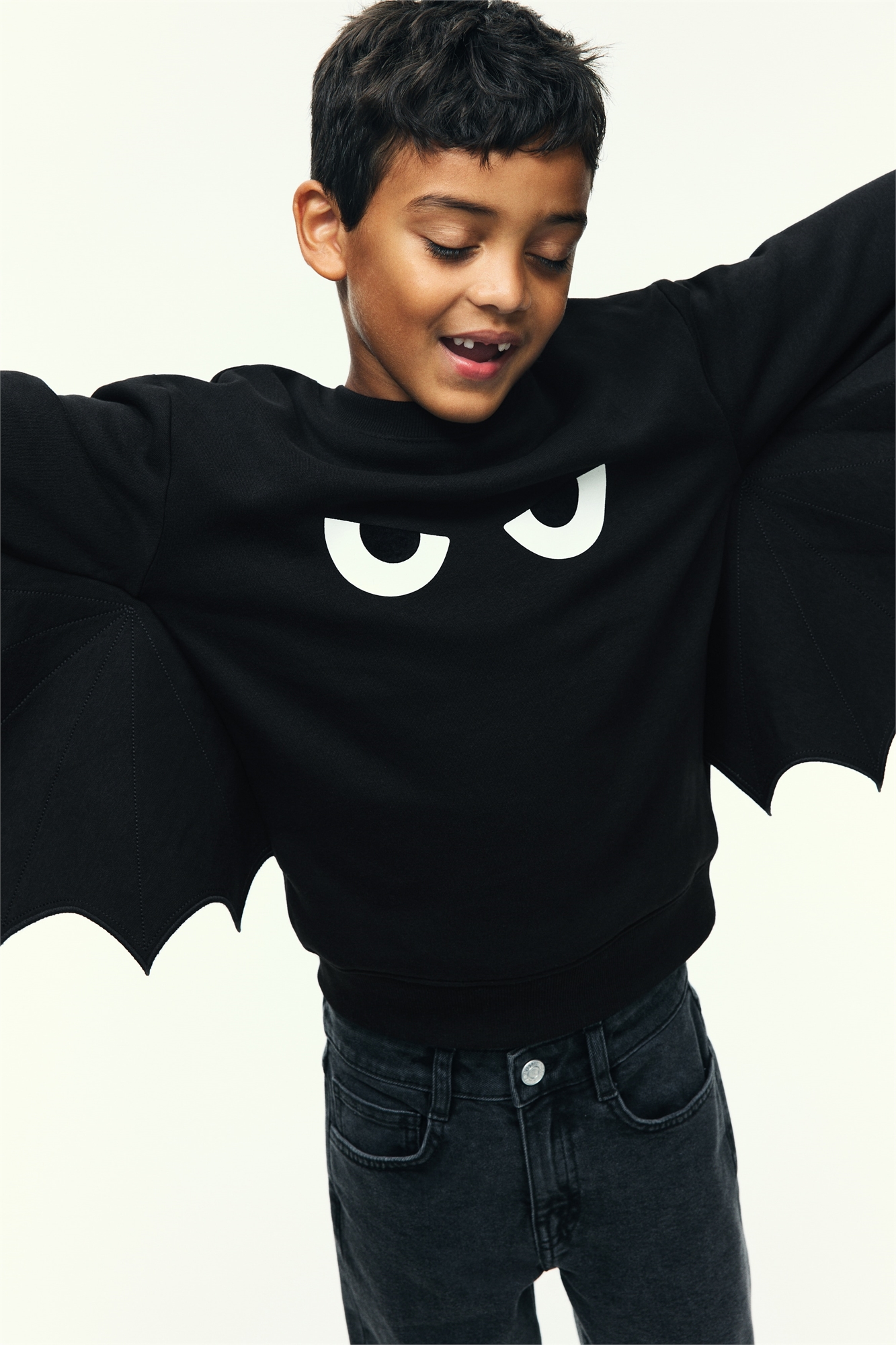 Топ из легкой толстовочной ткани с принтом спереди и аппликациями в виде крыльев летучей мыши. Круглый вырез с ребристой отделкой, спущенные плечи и длинные рукава. Ребристые манжеты и подол.