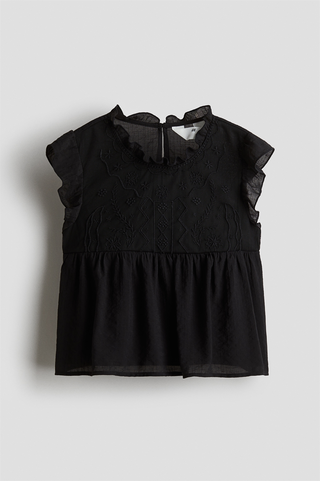 Блузка с рукавами из карего полотна и кружевной вставкой спереди. Круглый вырез с оборками и отверстие для ключа с пуговицей сзади. Собранный шов на талии придает дополнительный объем.