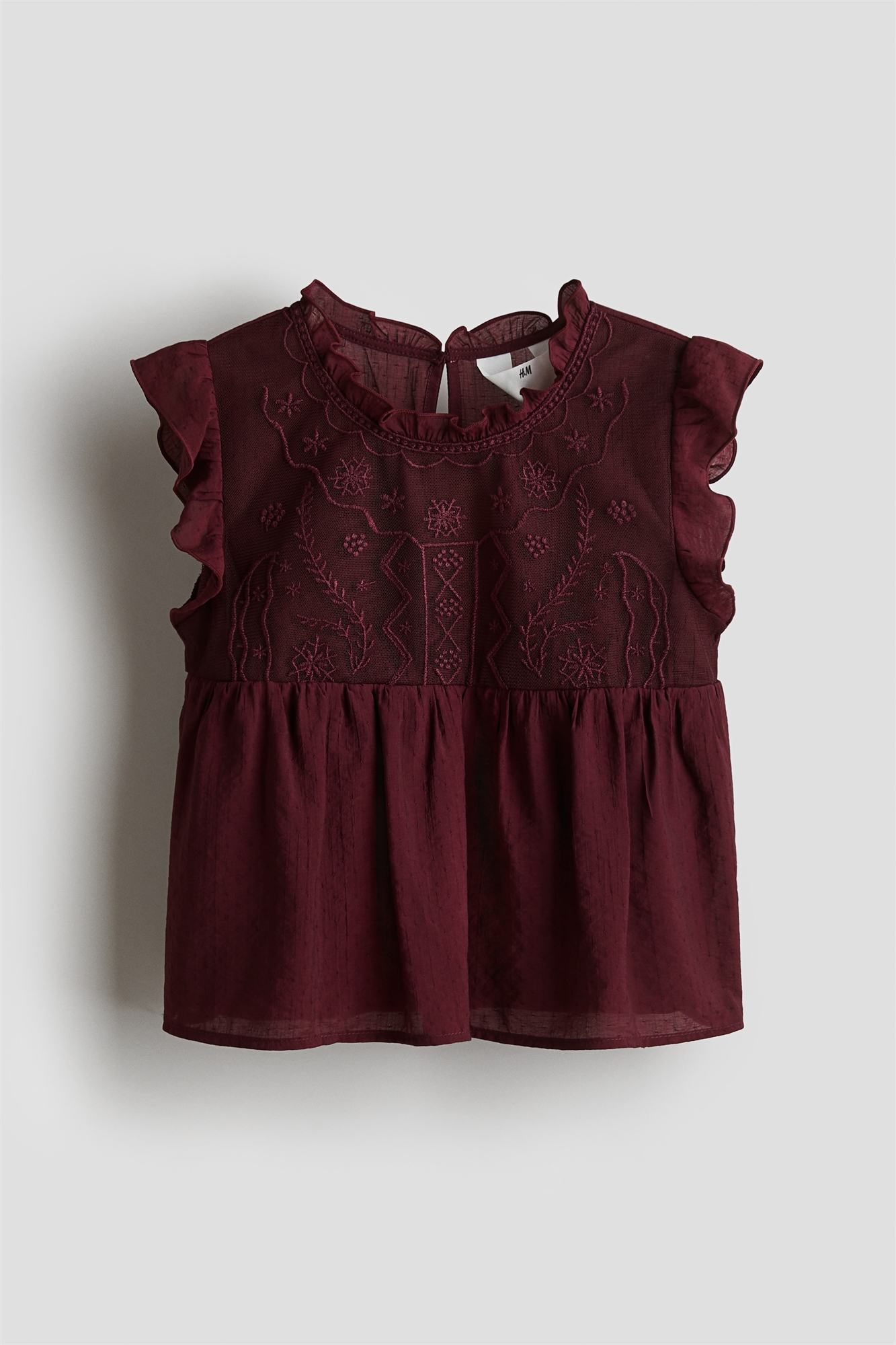 Блузка с рукавами из карего полотна и кружевной вставкой спереди. Круглый вырез с оборками и отверстие для ключа с пуговицей сзади. Собранный шов на талии придает дополнительный объем.