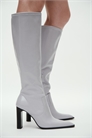 Сапоги на каблуке из лакированной ткани с оттопыренными носками и голенищами до колена, застегивающимися на молнию с одной стороны. Подкладка и стелька из джерси.