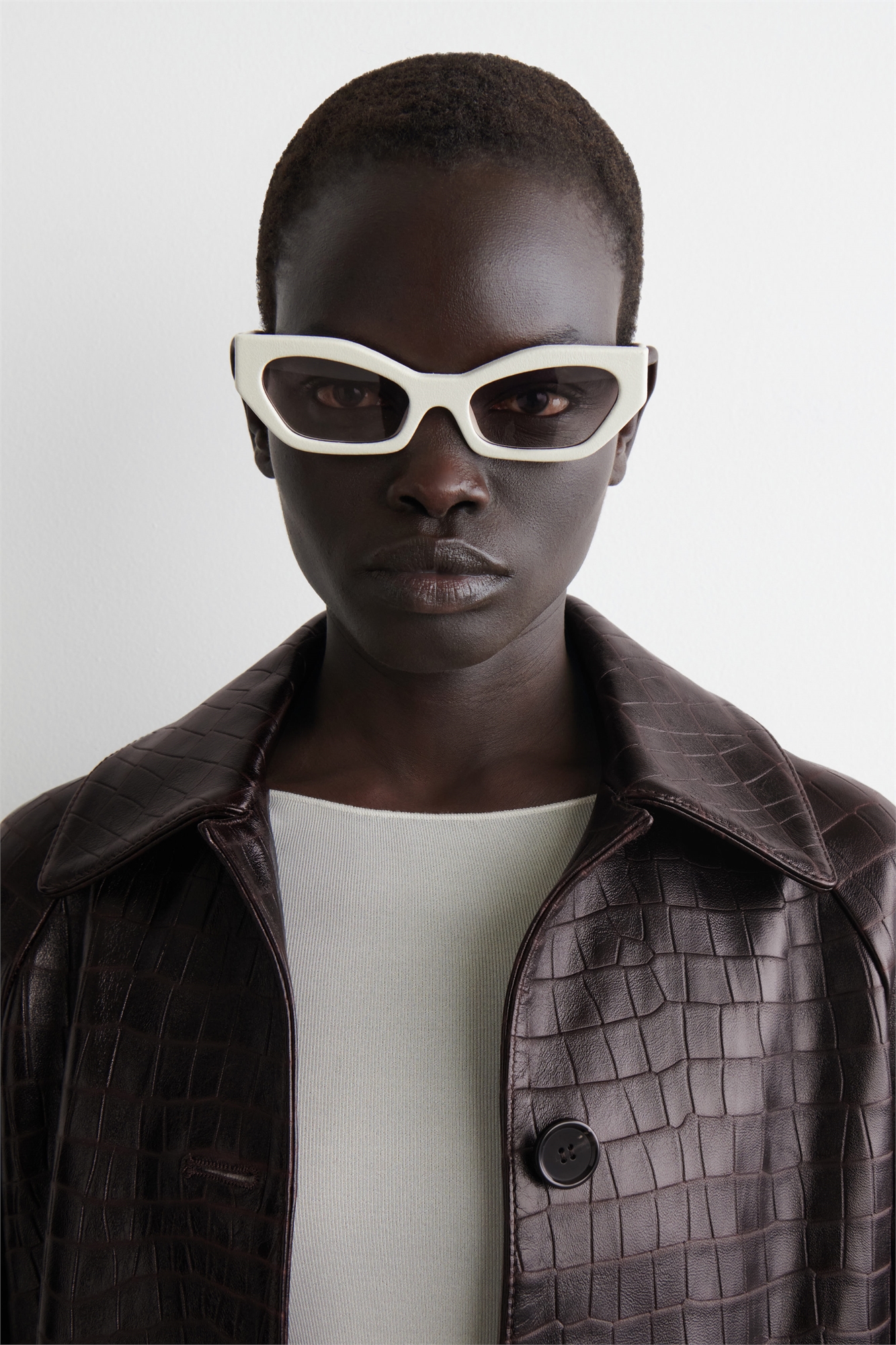 Коллекция аксессуаров COS отличается неожиданными дизайнерскими деталями. Эти современные солнцезащитные очки, обтянутые тактильной белой кожей, имеют угловатую оправу "кошачий глаз" и линзы розового цвета. Поставляются с защитным футляром100 % защиты от ультрафиолетаЭтот аксессуар имеет маркировку CE категории 3, которая обеспечивает высокий уровень защиты от солнечных бликов и хорошую защиту от ультрафиолета Оправа: 91 % переработанного полиметилметакрилата, 9 % кожи. Дужки: 60 % полиметилметакрилата, 31 % латуни, 9 % кожи. Линзы: 100 % полиамид (нейлон). Детали исключены