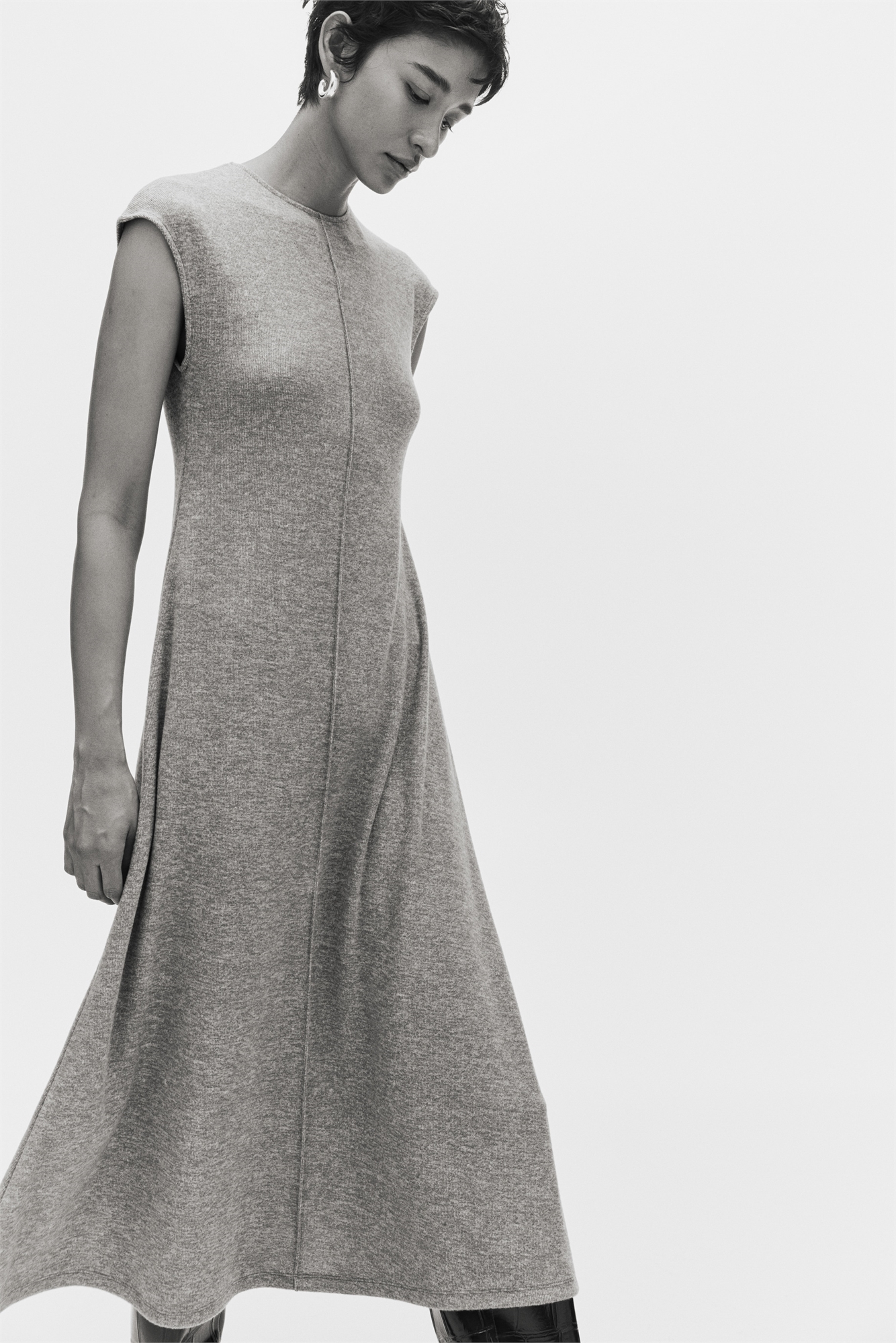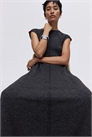 Платье длиной до колен из джерси с круглым вырезом, рукавами-капельками и расклешенной юбкой. Спереди и сзади пришиты пинетки.