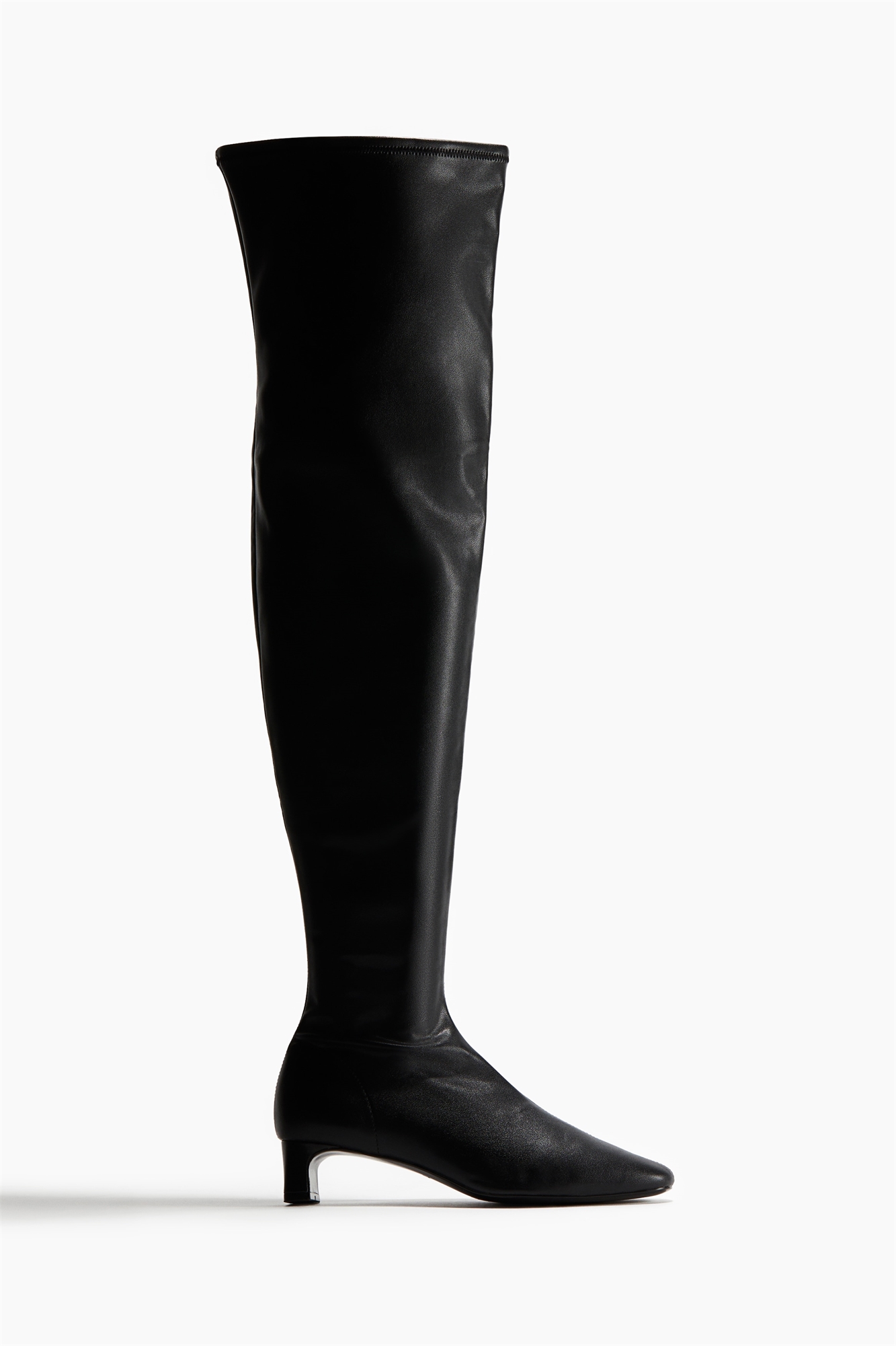Сапоги с носком выше колена, застежкой на молнию с одной стороны, миндалевидными носками и закрытым каблуком. Атласные подкладка и стелька.