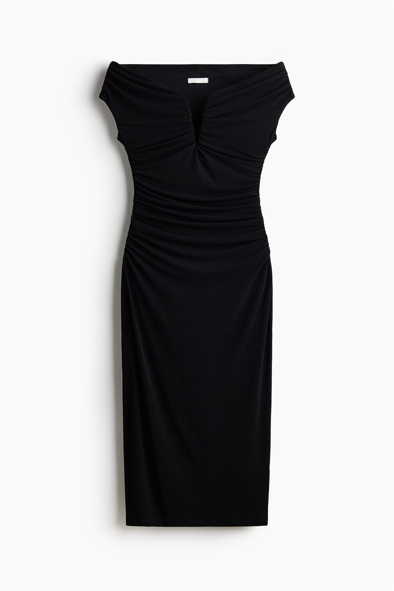 Приталенное платье длиной до колен из плотного джерси с вырезом на плечах в форме сердца, дополненным проволочными косточками спереди. Сборки по бокам создают эффект драпировки и придают силуэту привлекательность.