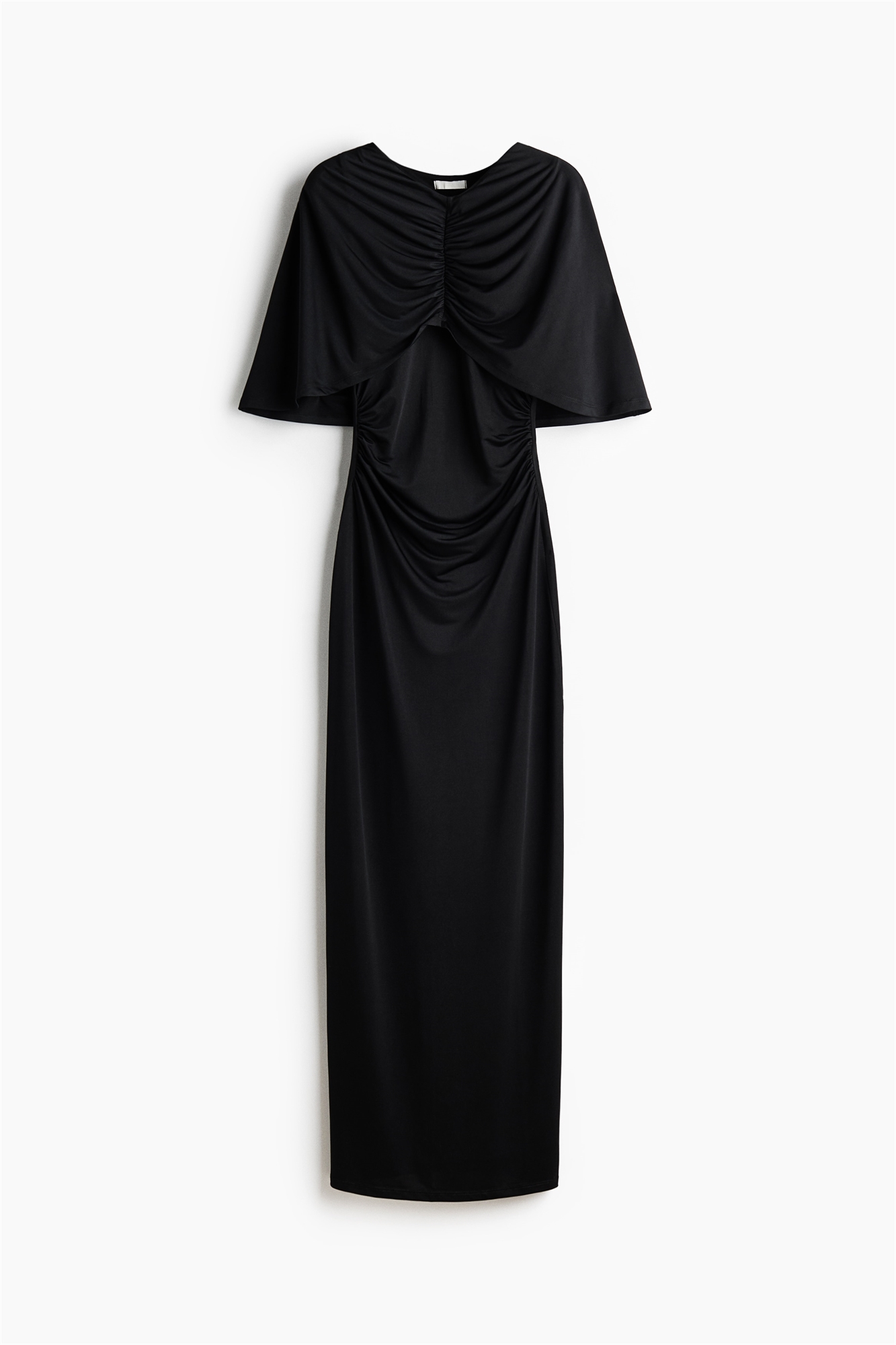 Платье из джерси длиной до колен с круглым вырезом и накидкой в виде плаща с собранным швом спереди и сзади. Сборка на талии для эффекта драпировки.
